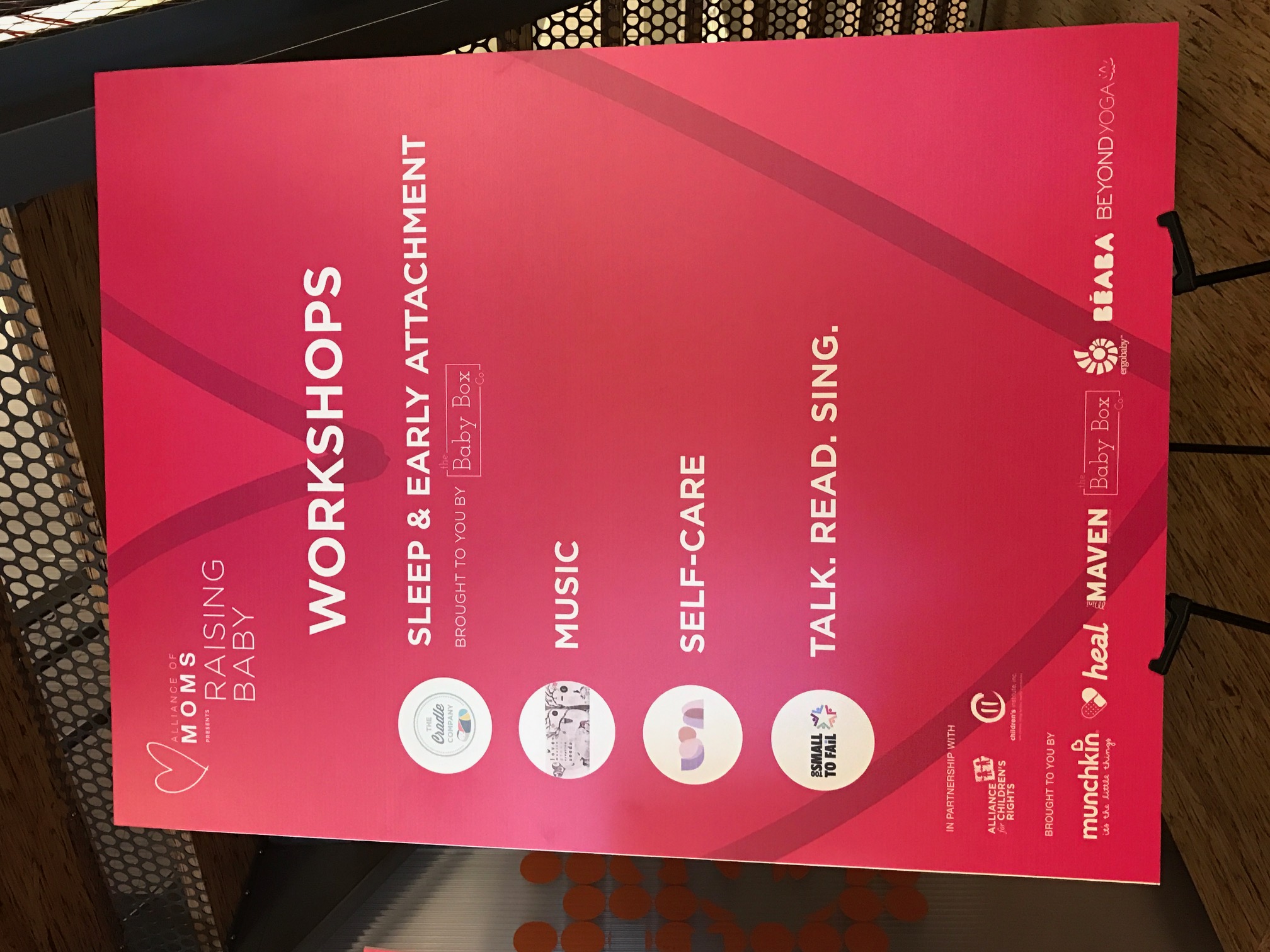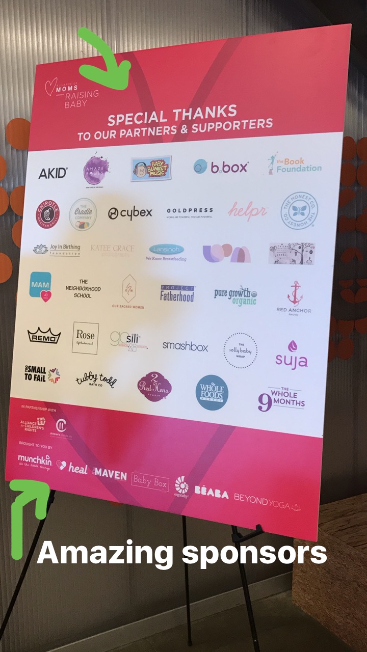 Sponsors included AKID, Cybex, B.Box, Baby Blanket Music, The Book Foundation, Chipotle, The Cradle Company, Goldpress, helpr App, The Honest Co, Joy in Birthing Foundation, Katee Grace Photography, Lasinoh, Red Anchor Photo, Pure Growth Organics, Project Fatherhood, Our Sacred Women, The Neighborhood School, MAM, REMO, Go Sili, Rose, Smashbox, SollyBaby, Suja, Too Small to Fail, Tubby Todd, 2 Red Hens, Whole Foods, the Whole 9 Months and so many more!