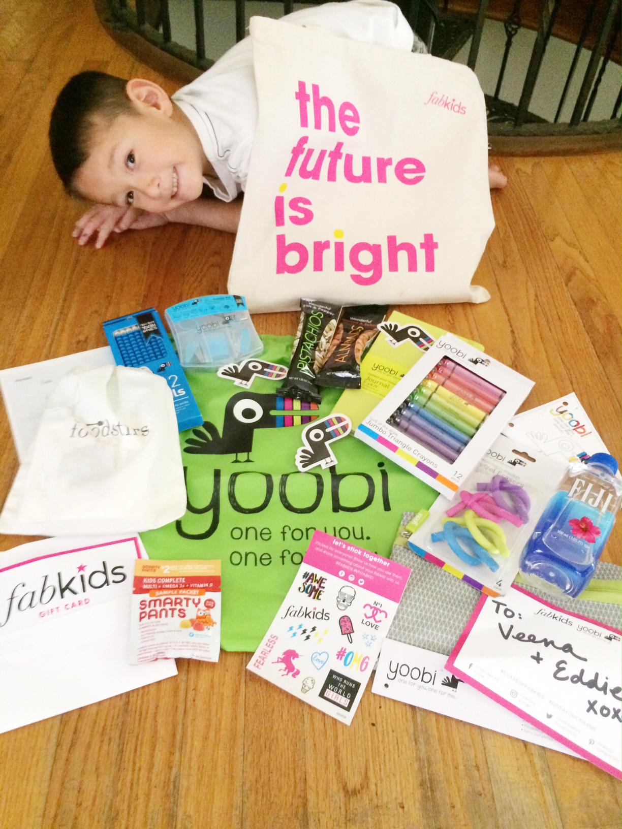 Gift Bag Goodies: Yoobi School Supplies, Smarty Pants, Fab Kids Gift Card, Wonderful Nuts, Foodstirs Brownie Mix