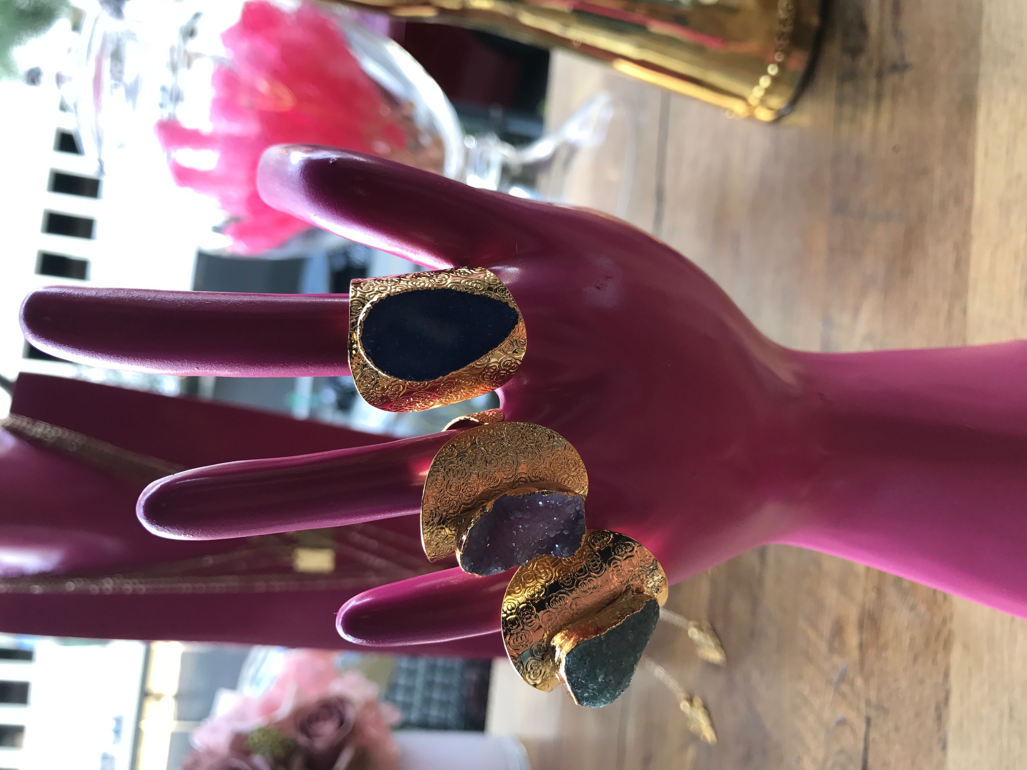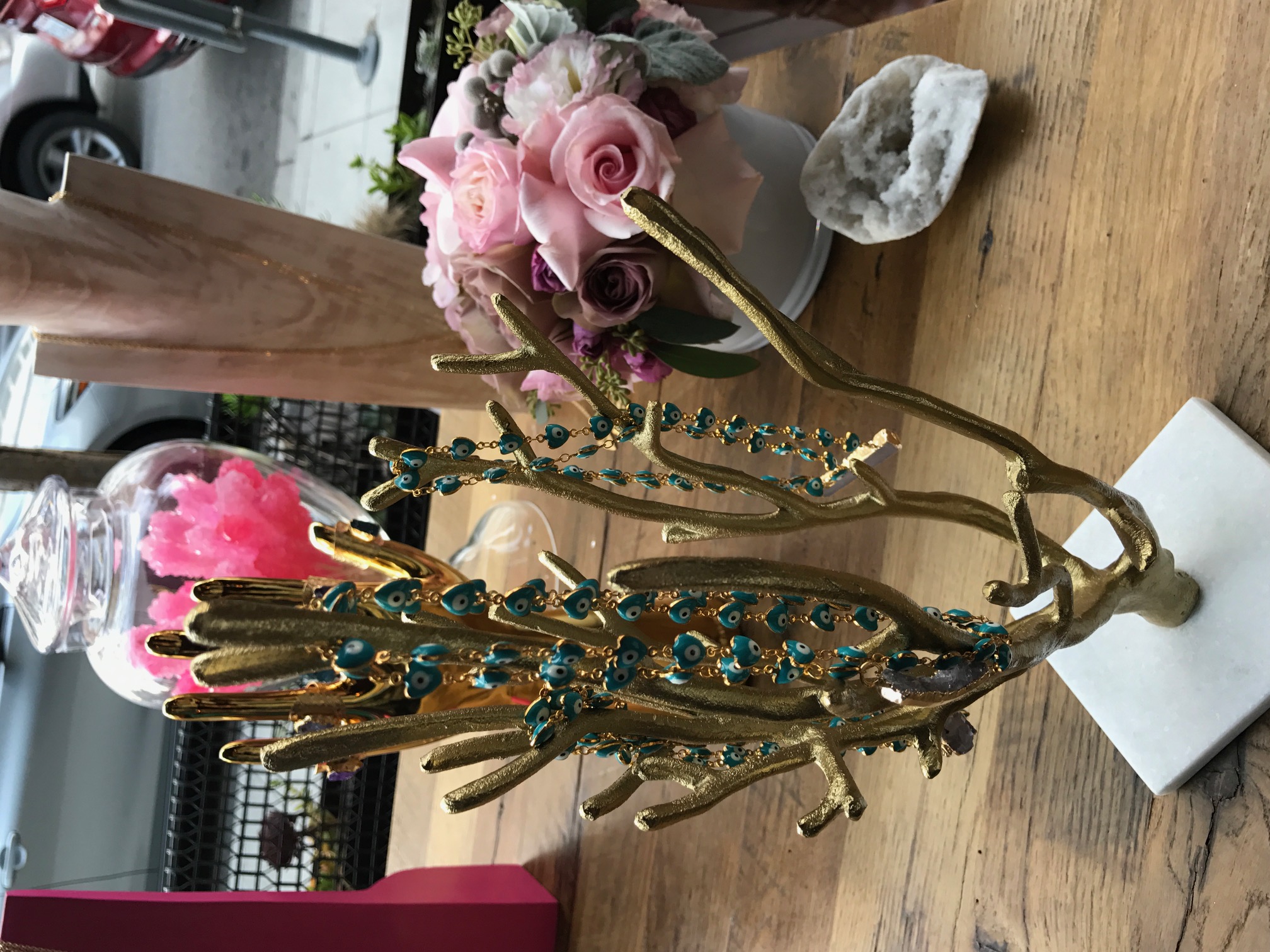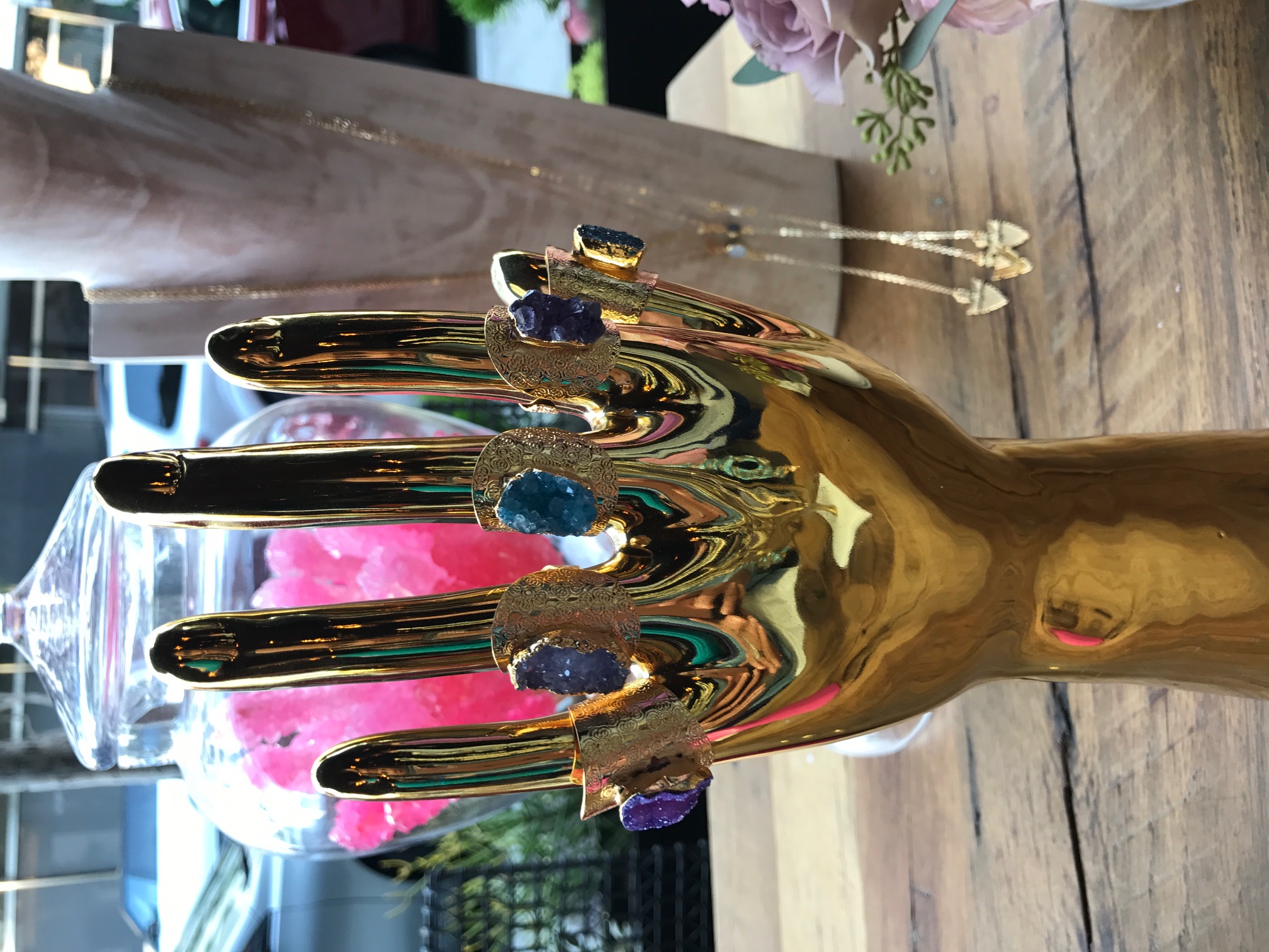 This new collection blends the healing and spiritual aspects that you always see with Emma J Co jewelry but also adds in Dawn’s background of being part Cherokee and all things that make Dawn smile. I was obsessed with the inclusion of the turquoise evil eye, stamped heart pendant and bars, the large druzy rings (turquoise one is my fave) and the the long layering pieces with the arrowheads. See below pics.