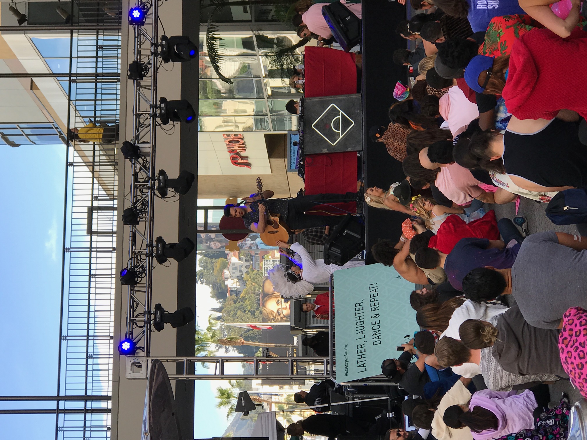 This morning, I threw on my super cute new Sweaty Betty #ReverseIt leggings, a Spiritual Gangster tank and a moto jacket and danced my way out the door at 6am to DayBreaker. I headed over to the main area of Hollywood and Highland where #DUO was sponsoring the morning for their new Ivory, Olay and Old Spice DUO shower sponge (more later). At 6:01am it was going off already. DJ A-track was spinning and everyone in the crowd was wearing bathrobes freely moving to the beat. Just seeing the costumes for the morning made me smile. It was like a day time rave. Some people were wearing unicorn onsies, other people had rubber duckies around their waist and some just had on more of my uniform. No matter what you were wearing, everyone had a smile on their face as they “Broke Day” together.
