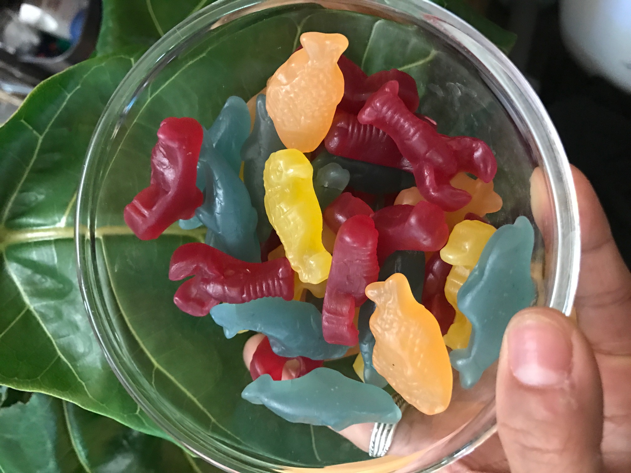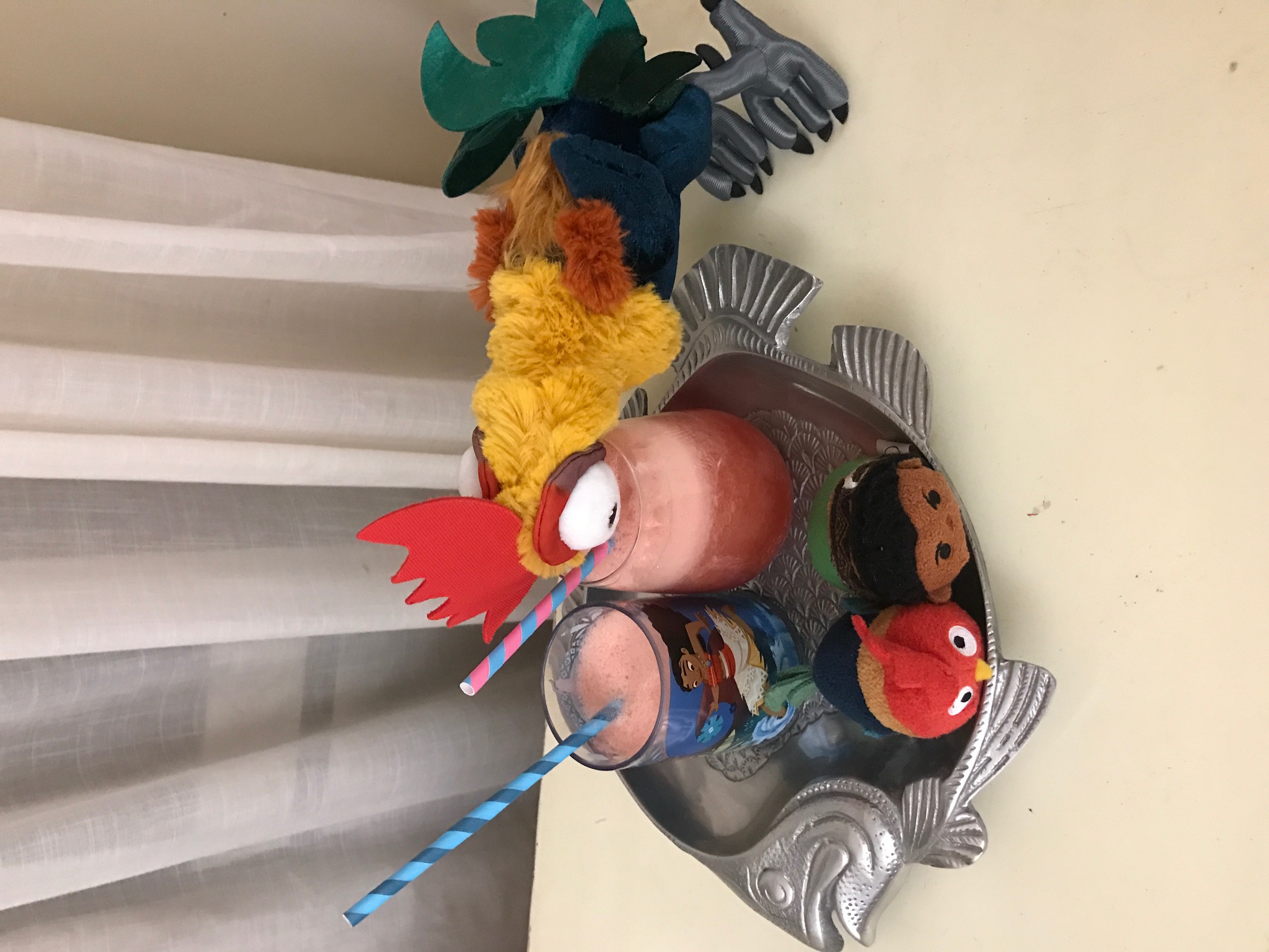 My little guy and I had a blast prepping for our party. We decided on an “island” theme of food. For drinks we made fresh watermelon smoothies that we served in Moana cups. We made snack bowls with plantain chips and sea inspired gummies.