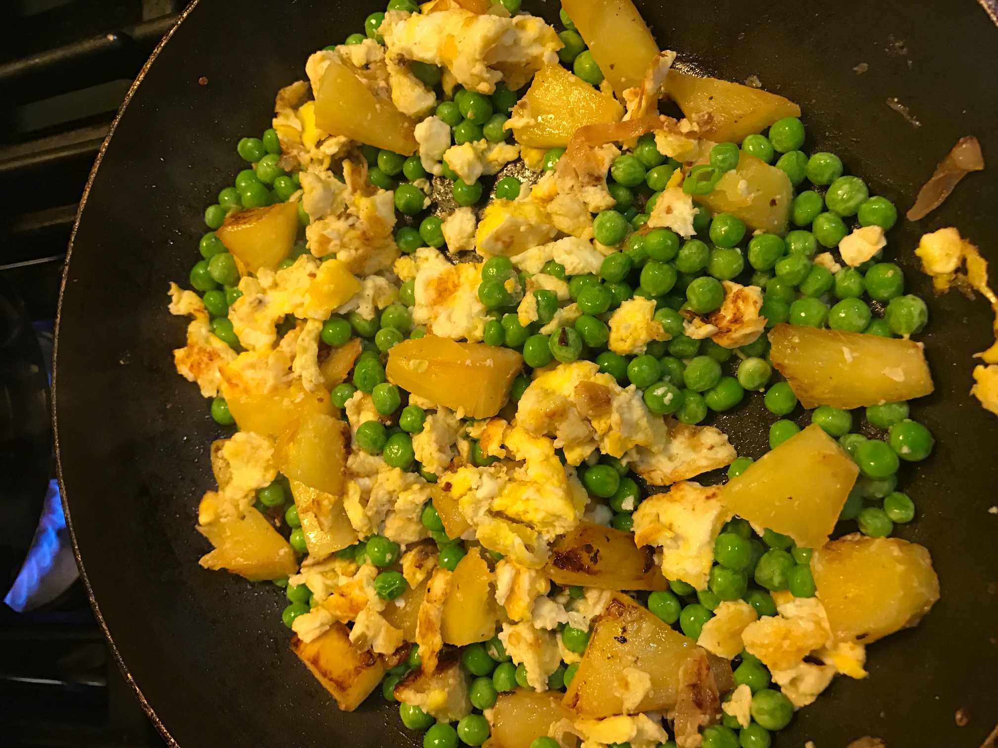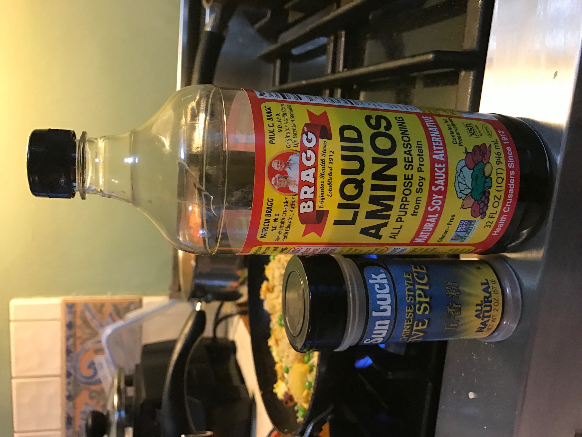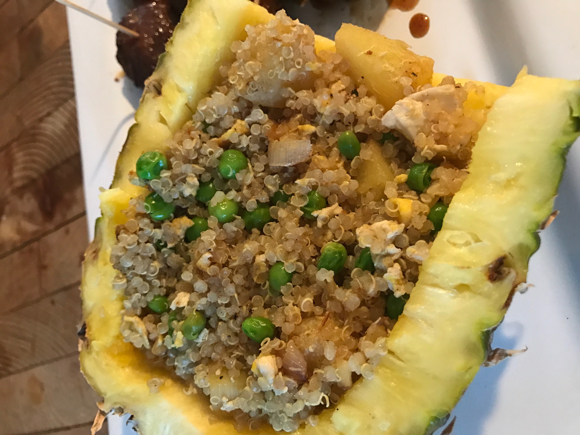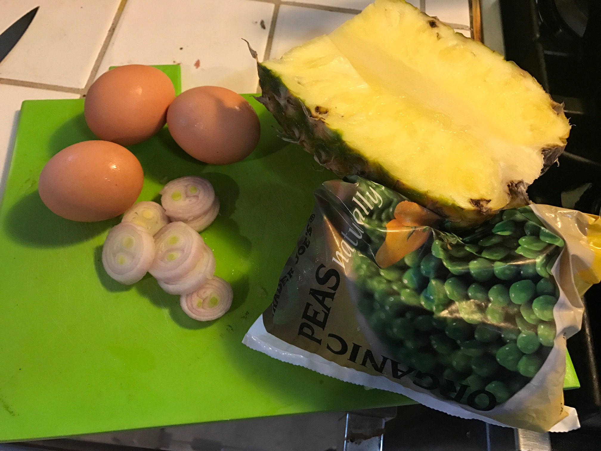 Ingredients: Pineapple Chunks fresh, Frozen Organic Peas, Quinoa, One Shallot thinly sliced, 2 eggs, Coconut oil, Chinese Five Spice, Finely Ground Pepper and Amino Acids