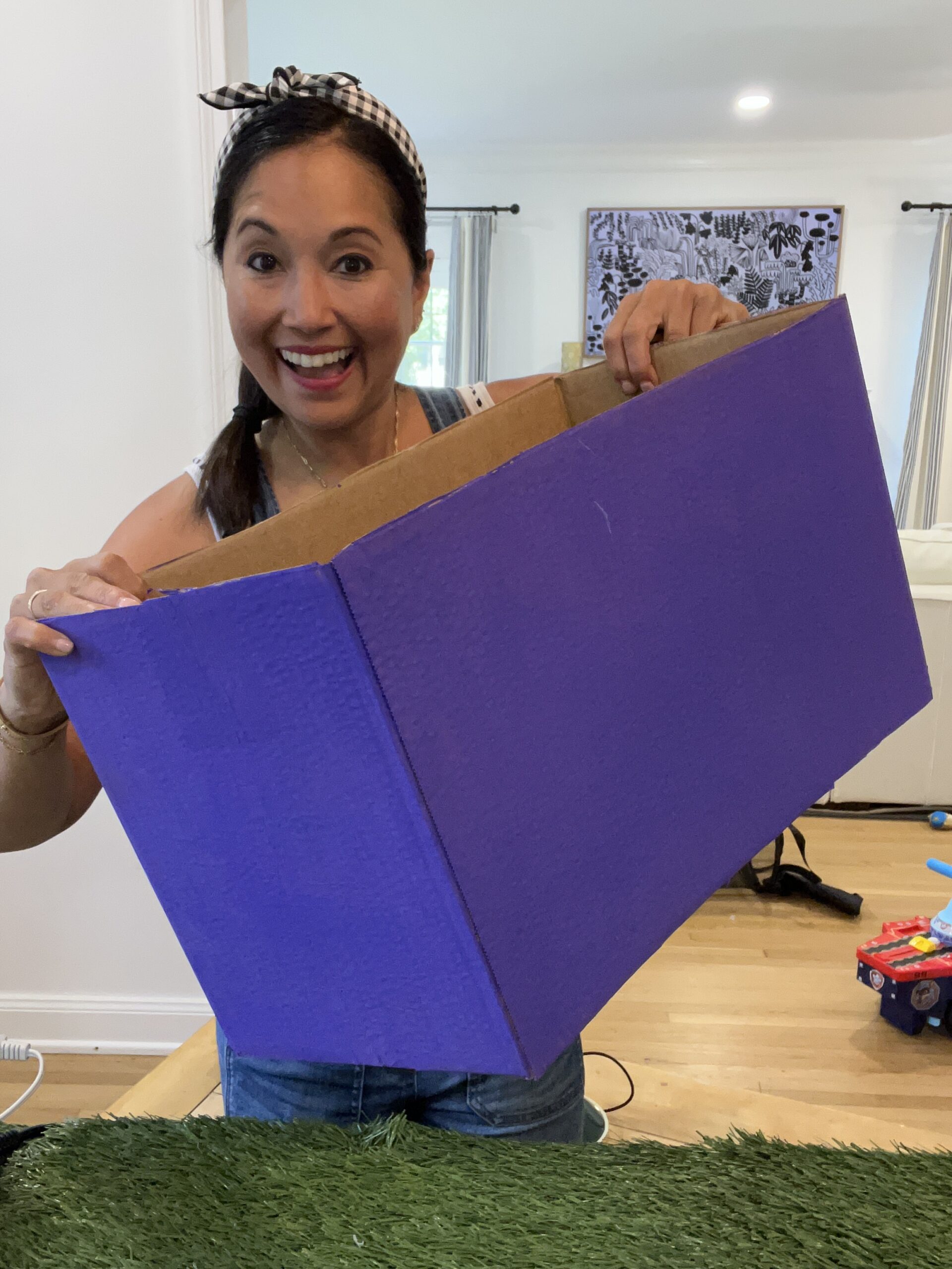One of my biggest tips to making this costume is that you need to plan for at least 3 layers of paint on the box. Its fairly simple and budget friendly. Once finished, I got Max a purple sweatsuit to wear under cardboard Carlita which I felt great about investing in since he can wear until he grows out of it. These cardboard Gabby’s Dollhouse costumes will be one of kind and a definite hit on Halloween! For the adult Cakey costume, I used an old pop up hamper to wrap felt around to make the cupcake body. Its super fun and it gives you a nice shape! Huge fans of these DIY costumes and I think you will be too!