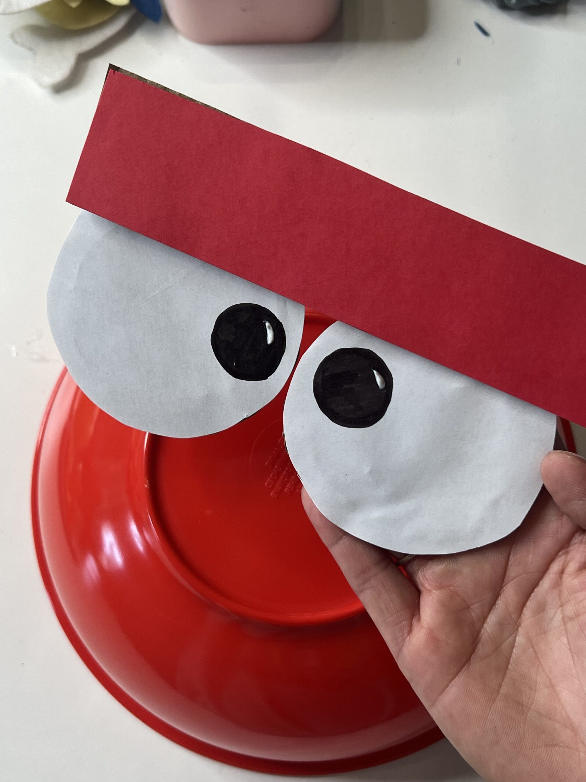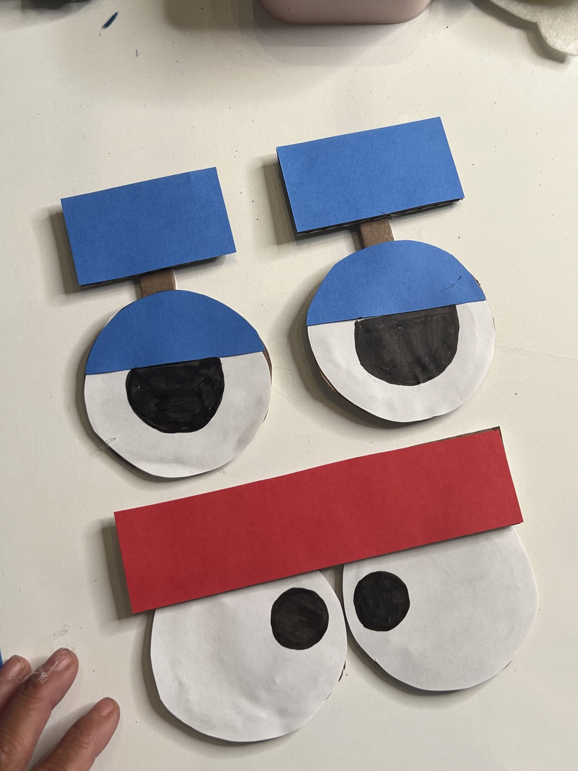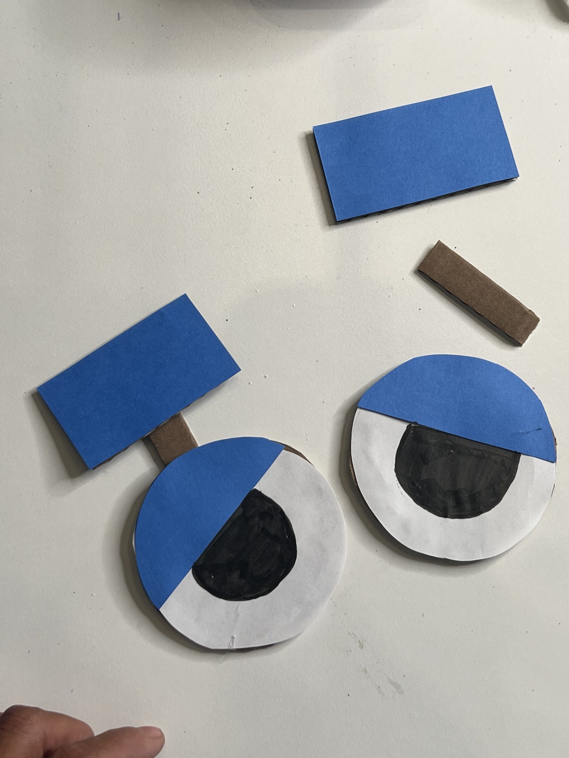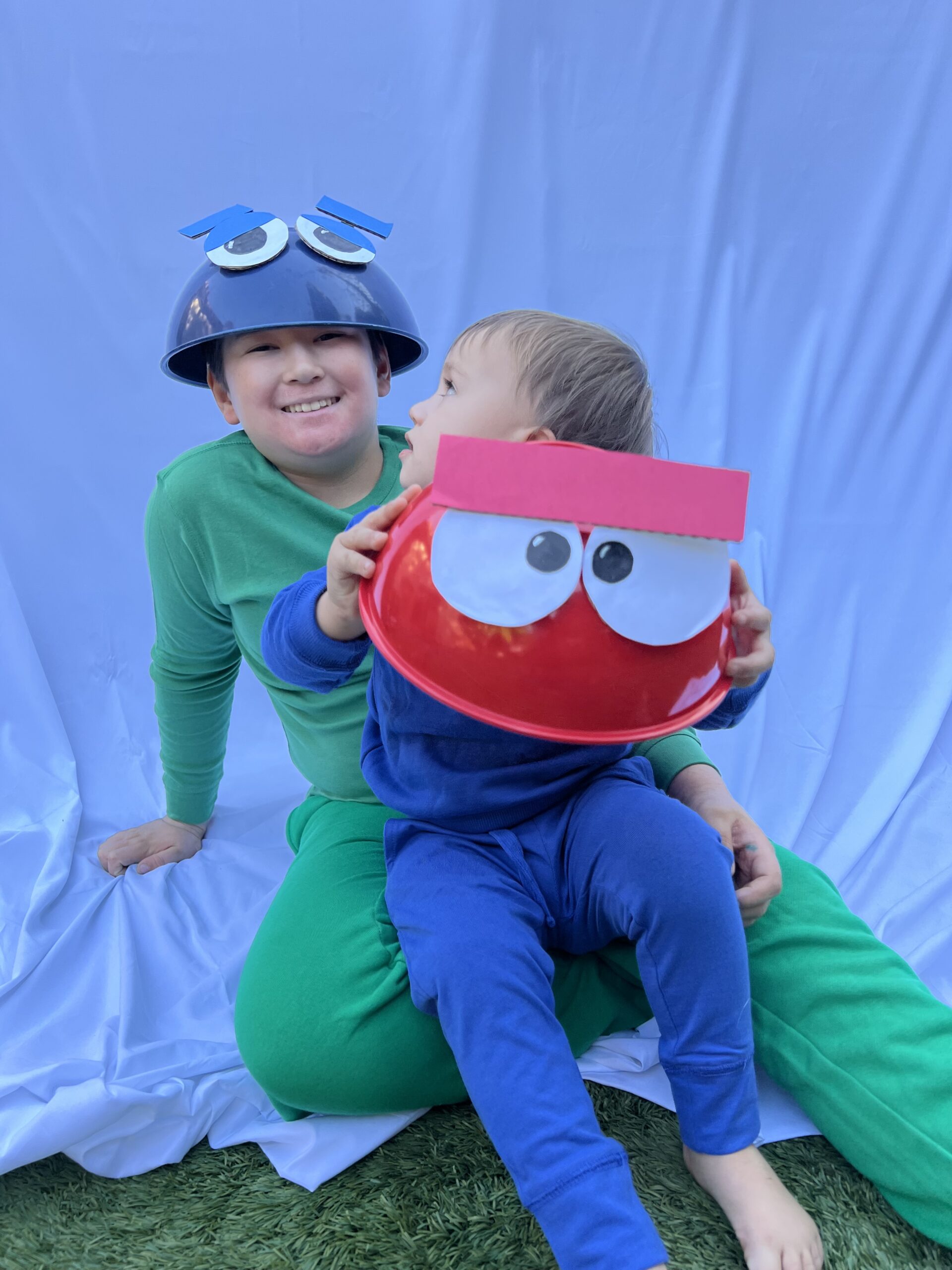Story Bots are larger than life in so many ways but playful so that was what we were trying to do when we created the costumes. I liked making the head piece out of a bowl because it was something fun and different and I found it at the dollar store. We used one from there and one bowl we had at home for each of the boys. I used a masking tape roll to outline the eyes on both the cardboard box and white paper. Cut both out at glue together. Next I cut out eyebrows for the Story Bots out of both fun colored construction paper and cardboard to give it some firmness and strength. For the red themed I did one giant eyebrow and glued it to the eyeballs, for the blue theme I but an extra sliver of cardboard and gave the eyebrows some height from the eyeballs which I thought was fun plus eyelids in the matching blue. Next, color in your eyeballs and hot hot glue everything to the bowls and boom…that’s it! Have your kids put on their solid color pants and shirts and maybe even a puffy vest if it’s chillier in your area.