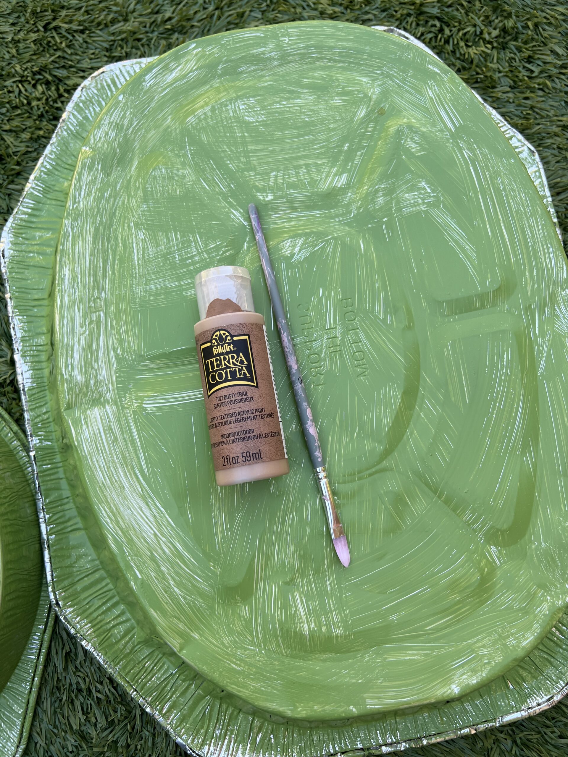 Take your single use oven roasting pains and paint the backside green. It doesn’t need perfect coverage. I did one layer of paint and it was streaky which gives it a cool texture. Be generous with the paint. Once that dries, take your brown paint and paint the lines/indents on the back of the oven pan you just roasted. I wouldn’t suggest using too much paint so it looks more like a turtle shell. I also took a paper towel and dipped it in the brown point and brushed the sides and back to give it some more realistic turtle shell like texture/vibe. That’s it! I used a knife to cut a slit on each side of each pan and then used the purple remnant to make a tie and a headband. Eddie slipped this on over his green sweatpants and shirt he already owned and it was a super fun costume; however he wanted an accessory to complete his costume so we decided to make Teenage Mutant Ninja Turtle Nun Chuks out of a pool noodle
