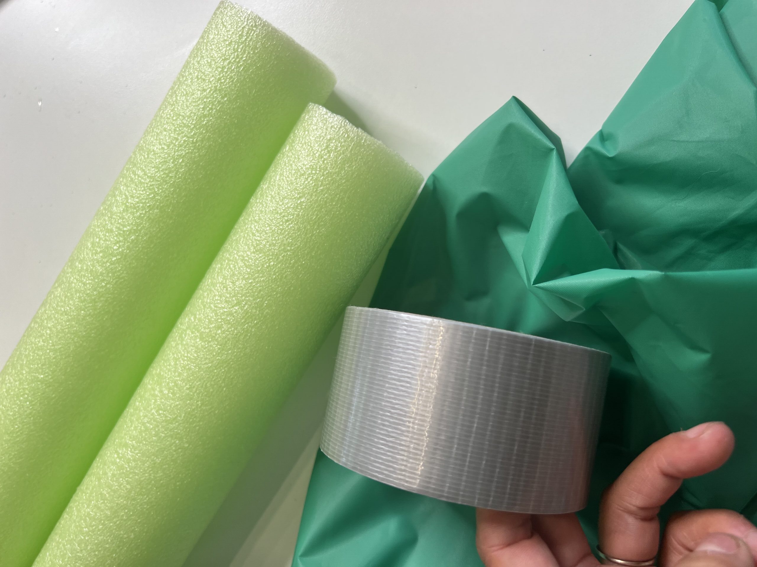 You are going to slice two even pieces of pool noodle. I find a sharp knife works best to cut straight with. and then I took a shred of a green tablecloth and twisted it and then glued the ends into the hole of each pool noodle and then wrapped the top of the table cloth and the pool noodle with duct tape to keep it together. Literally 5 min later Eddie had a super fun Teenage Mutant Ninja Turtle accessory. This has been a hit in our house since then.
