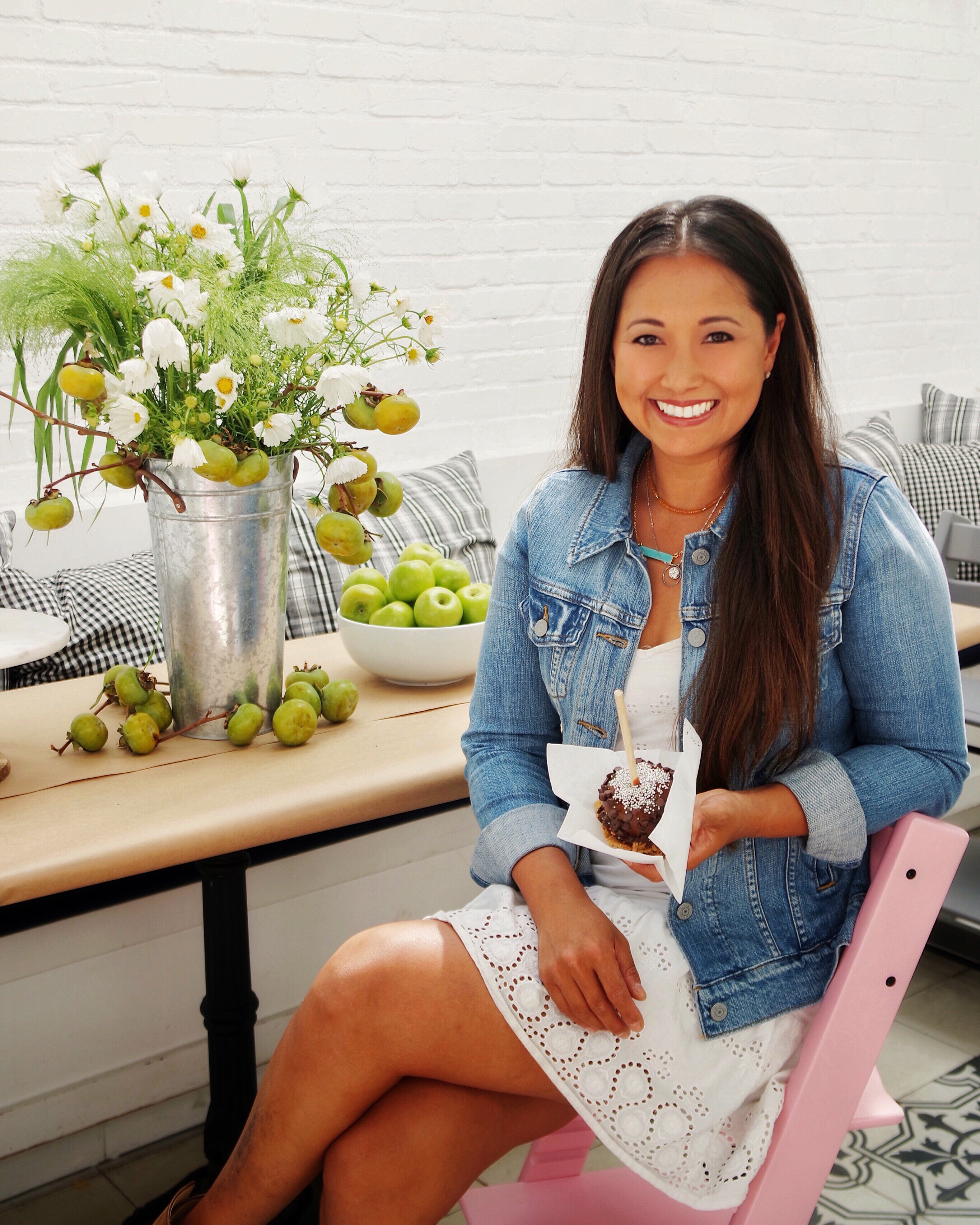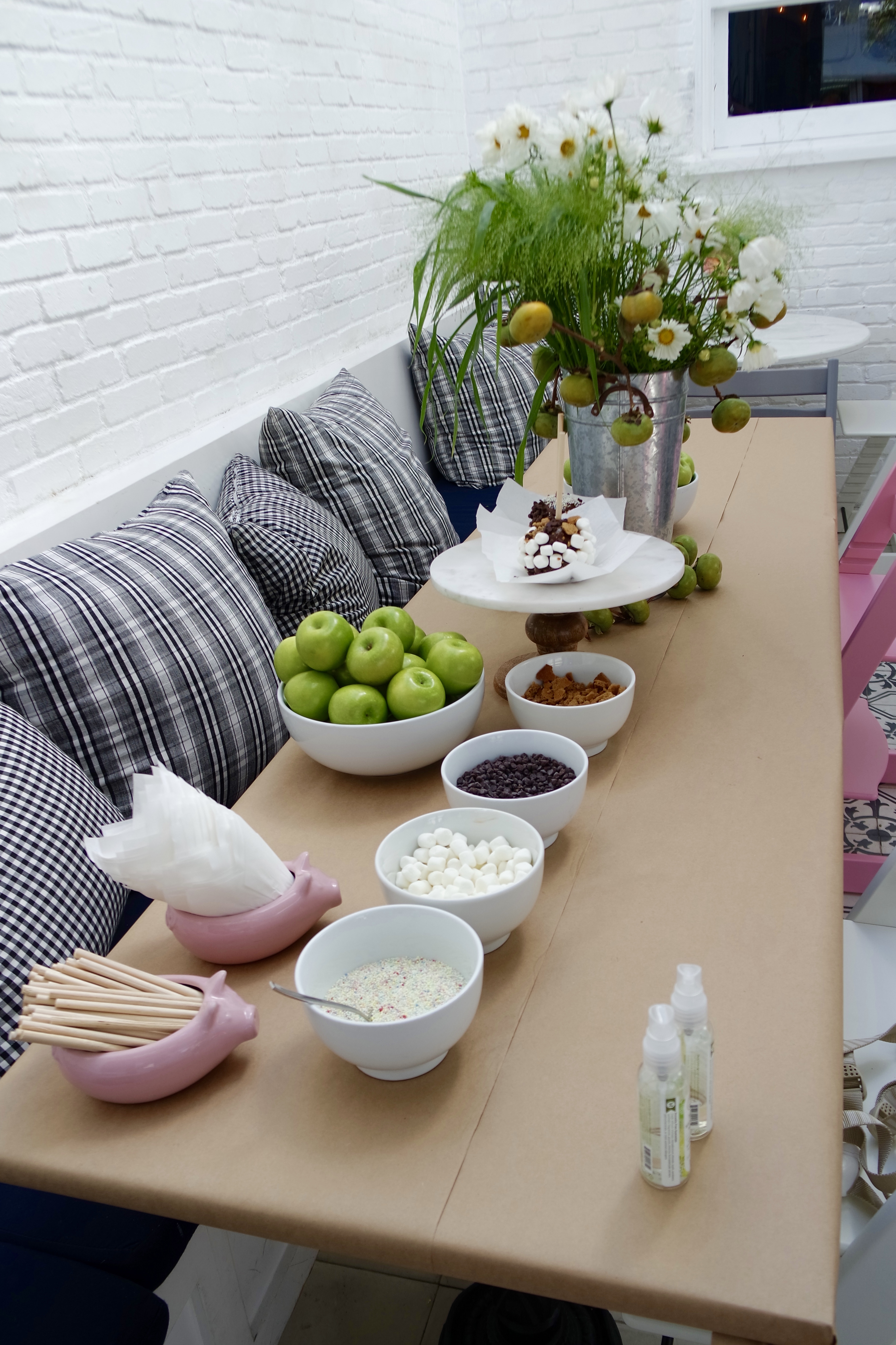 As I entered the Indoor/Outdoor Patio area, baby pink and gray Tripp Trapp’s replaced the usual patio chairs. With the black and white tile and fresh pink florals intermixed in the decor, I felt like I was transported to Paris. We made custom carmel apples…such a fun idea to do with my kiddo this FALL.