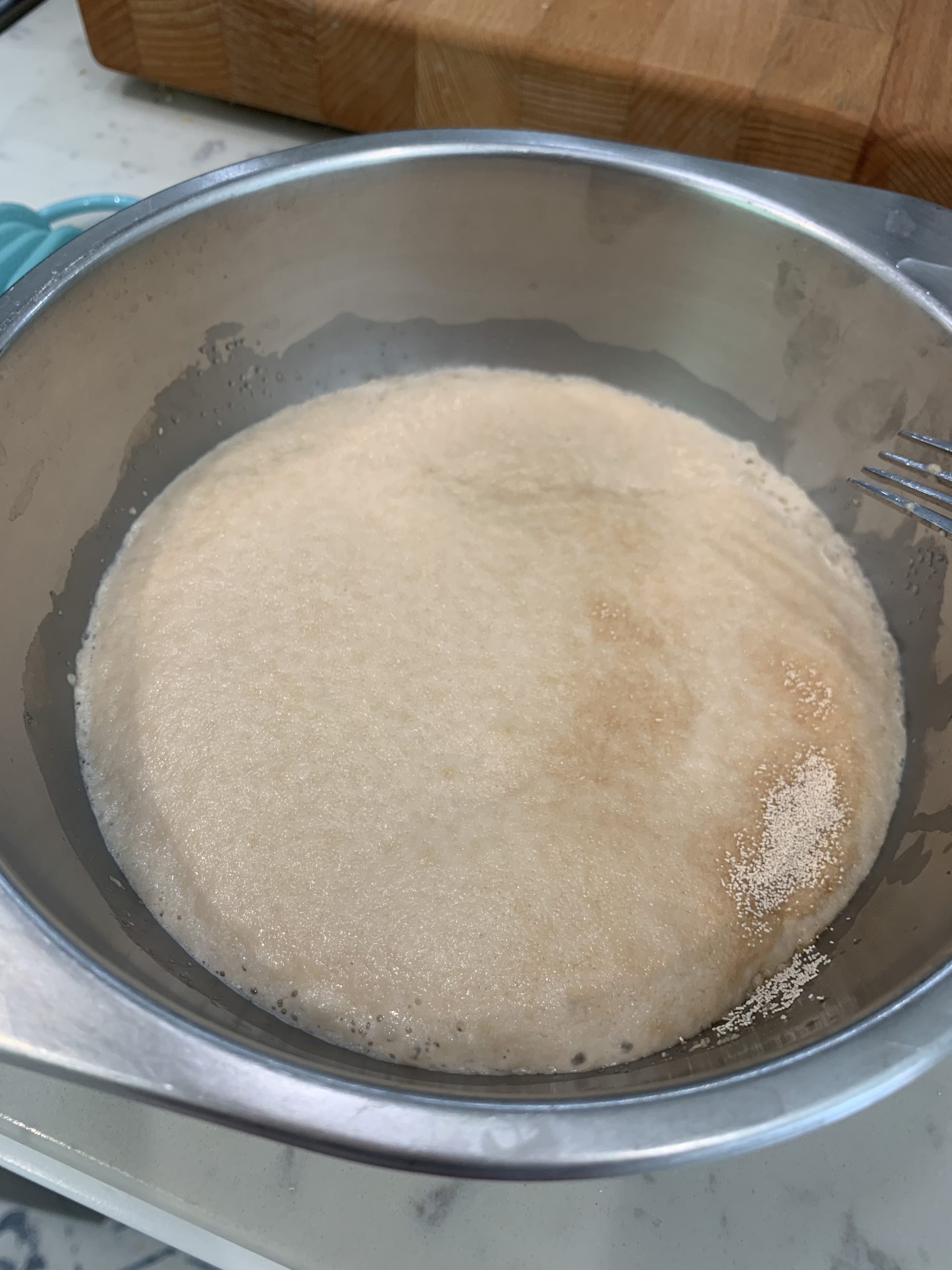 1. 2 tbsp sugar + 1 tsp salt, 1c warm water and mix. Now add 2.5 tsp (1 packet) active yeast and let foam on top. Do not mix. Wait 10 min