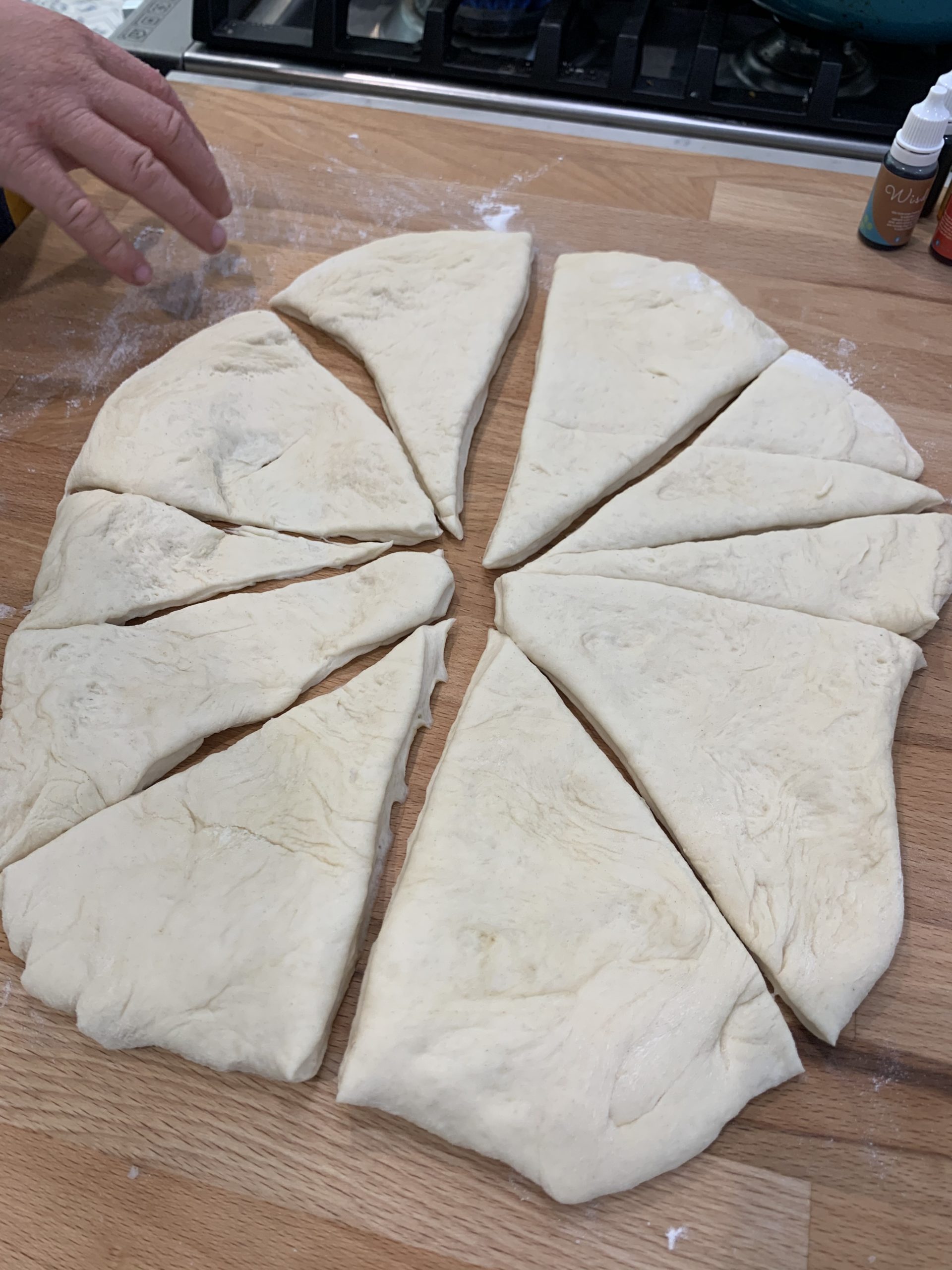 6. Take dough ball and flatten into a pizza shape and cute into 8-10 pieces. Roll into strips and shape into pretzels