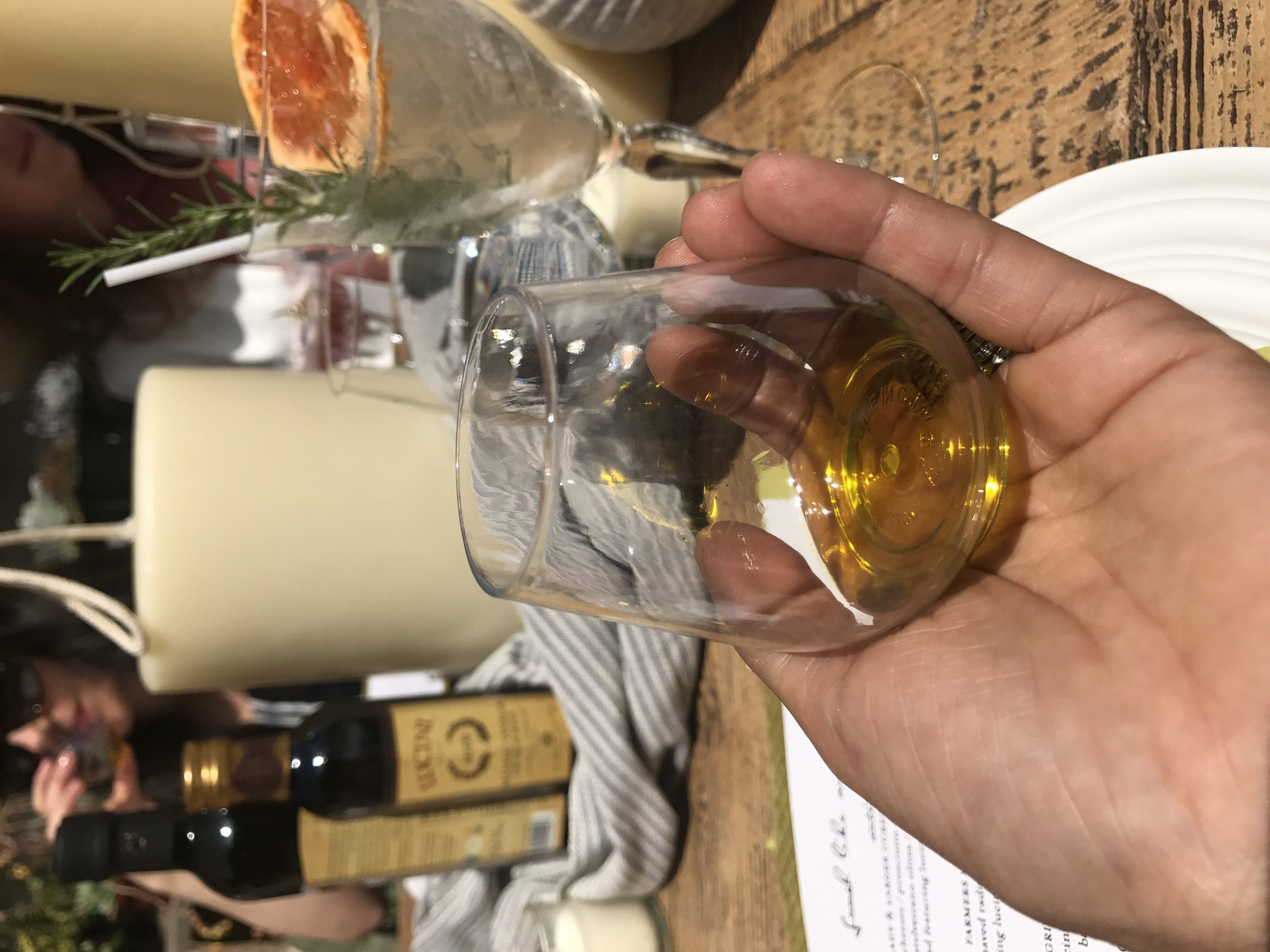 4. Swallow: Now swallow your olive oil. This step can either be easy or hard depending on the quality of olive oil you are tasting. The one that was high quality I was able to swallow without leaving an “oily” taste in my mouth although there is a slight stinging in the back of your throat from the polyphenols/antioxidants that were released. It may also make you cough. A lower quality olive oil will leave a oily/thick feeling in your mouth and throat and does not sit well in your stomach.