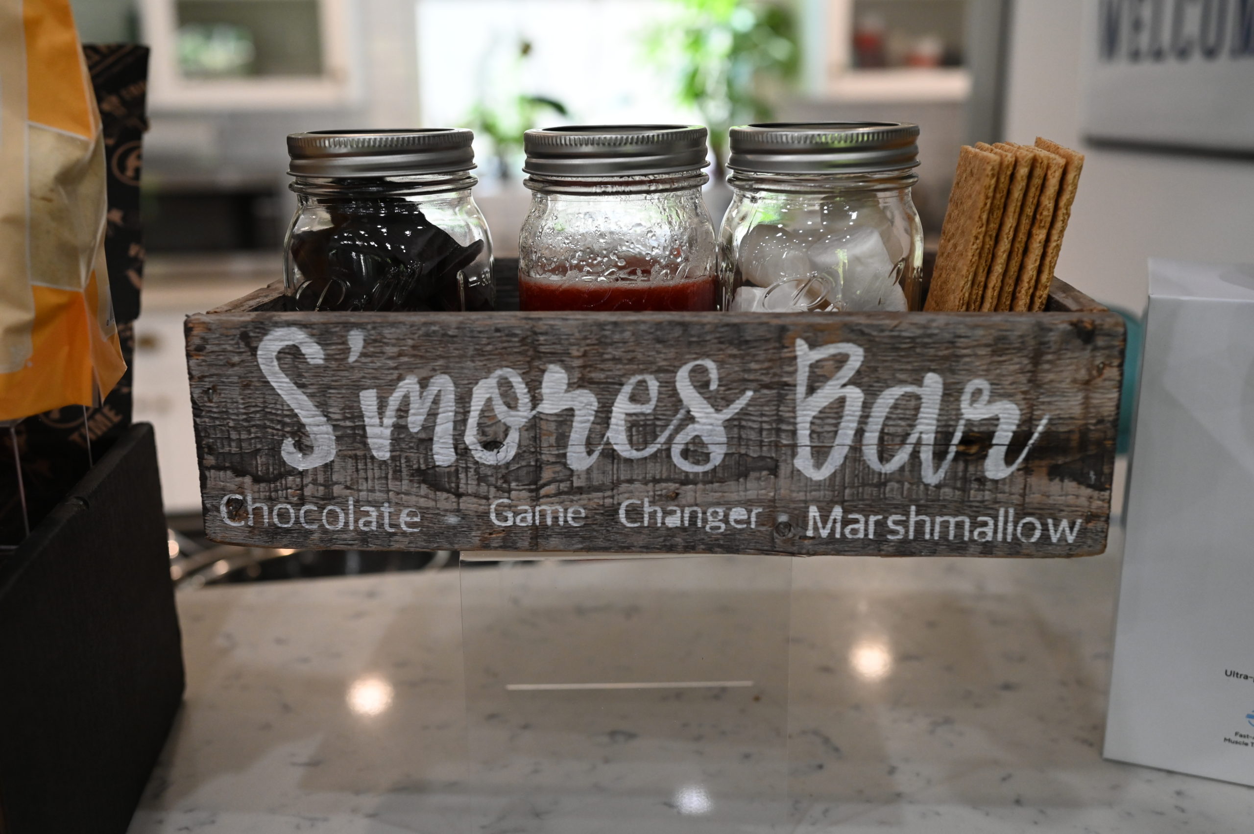 - DIY S’mores Bar: Made this with a reclaimed wood box from Amazon, made a stencil with Cricut and then personalized it with my hubby’s favorite homemade strawberry preserves which we put in our s’mores as a game changer