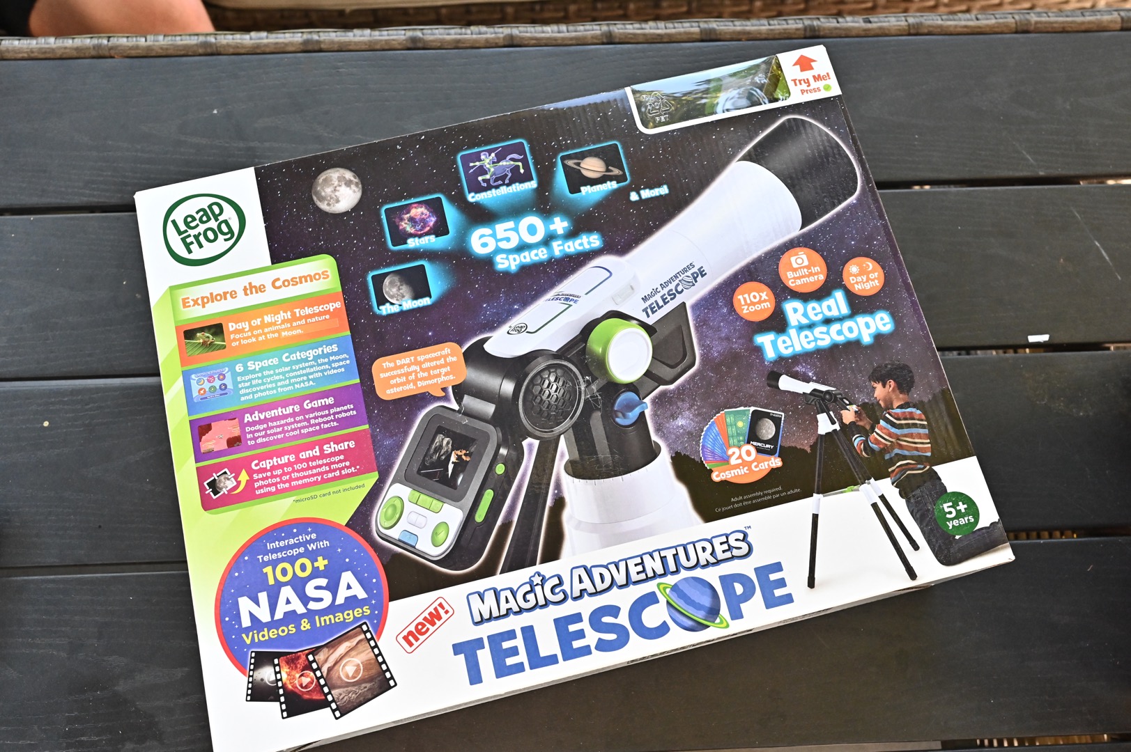 My kids have been wanting to get a telescope to see more closely and clearly the moon, stars and maybe some of the planets when they are close enough to our planet Earth. We have been going back and forth on what to get since we have a newly 3 year old and an almost 13 year old. We were introduced to the Magic Adventure Telescope by LeapFrog and I have to say it has exceeded all of our expectations. Since the mosquitos have had an affinity for us this summer, we have been exploring the fun parts of our yard with our telescope. For instance, this morning we saw what looked like a dragonfly who had gotten caught in a spider’s web in our neighbors yard. As we zoomed in, and brightened the screen we were able to see that in fact it was a dragonfly that got caught in the web and was currently being consumed by a large spider. It blew our minds. It was so fun to be able to see nature in action in such a clear and easy way plus we could take photos on our telescopes. Very very cool!