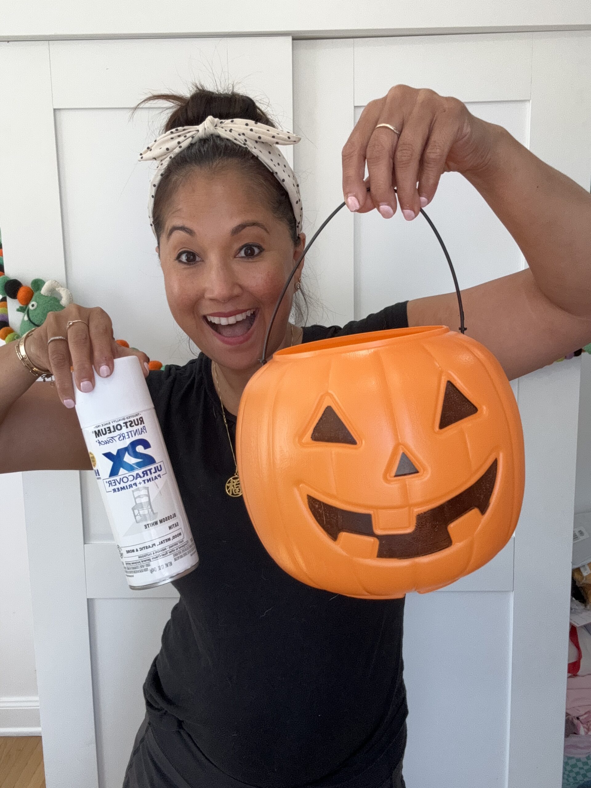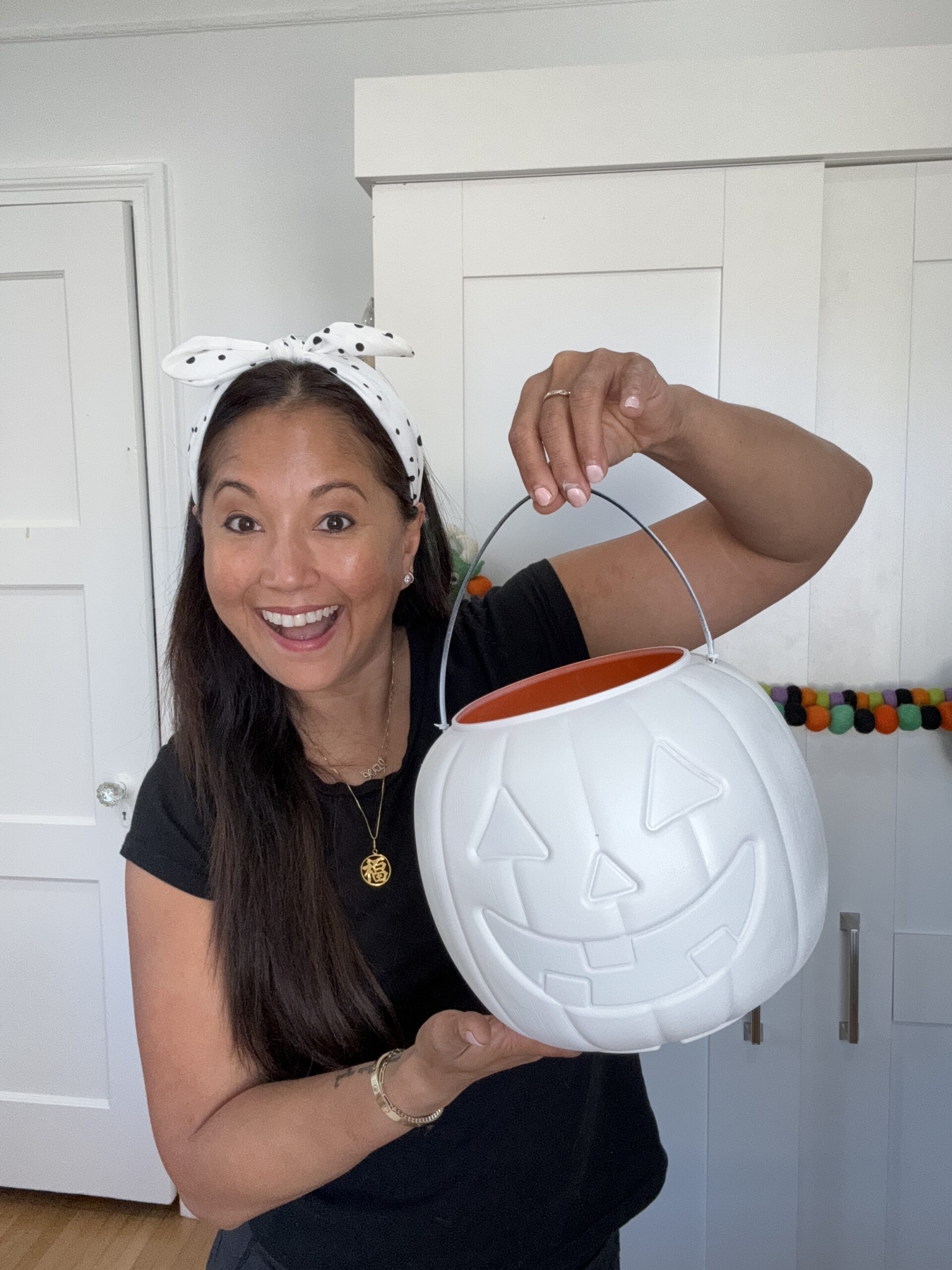 So we started with the plastic pumpkin pail we got from Walmart for $1.98. We decided to make a Poke ball out of it. First step was to spray paint it white. After it dried I used a piece of painters tape around the middle along with a mason jar lid part that was centered on the pail. I painted the top of the ball red with acrylic paint and then carefully removed the pianters tape and painted that area black. I used an acrylic pen to outline the area first and then black acrylic paint to fill it in. I spray painted the mason jar lid black and then used epoxy glue to adhere it. So easy and so cute to make a Poke ball pumpkin pail.