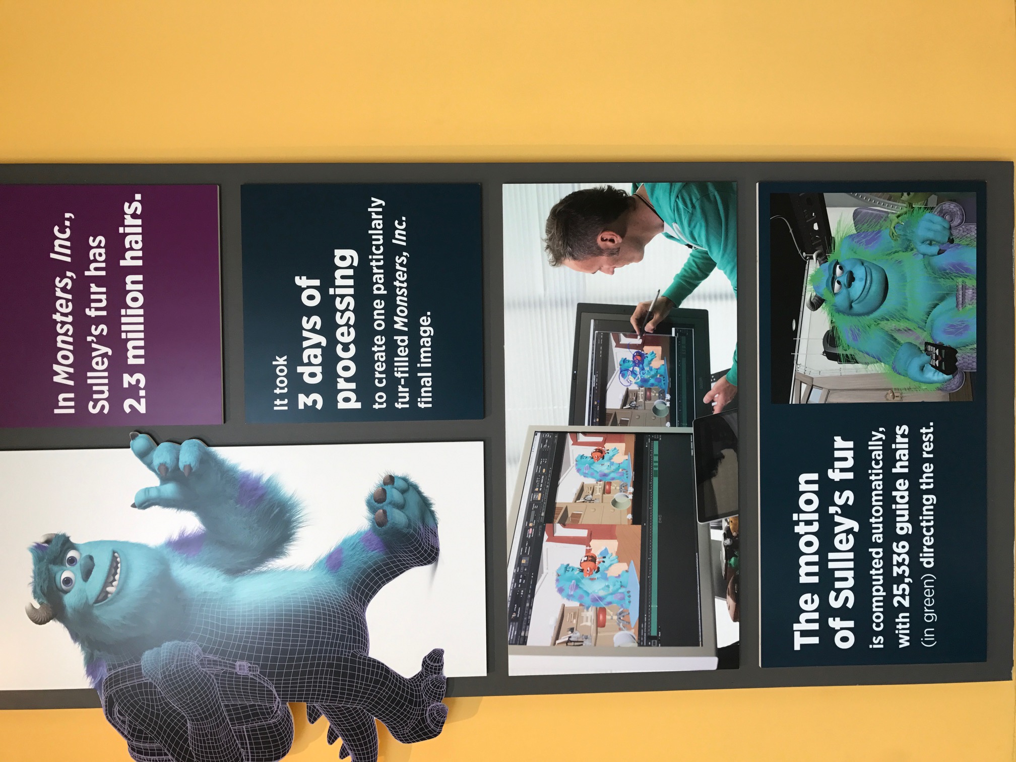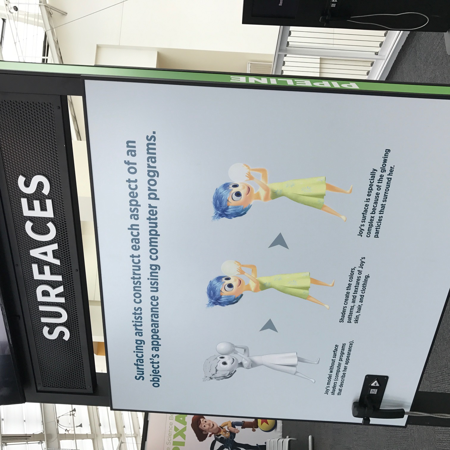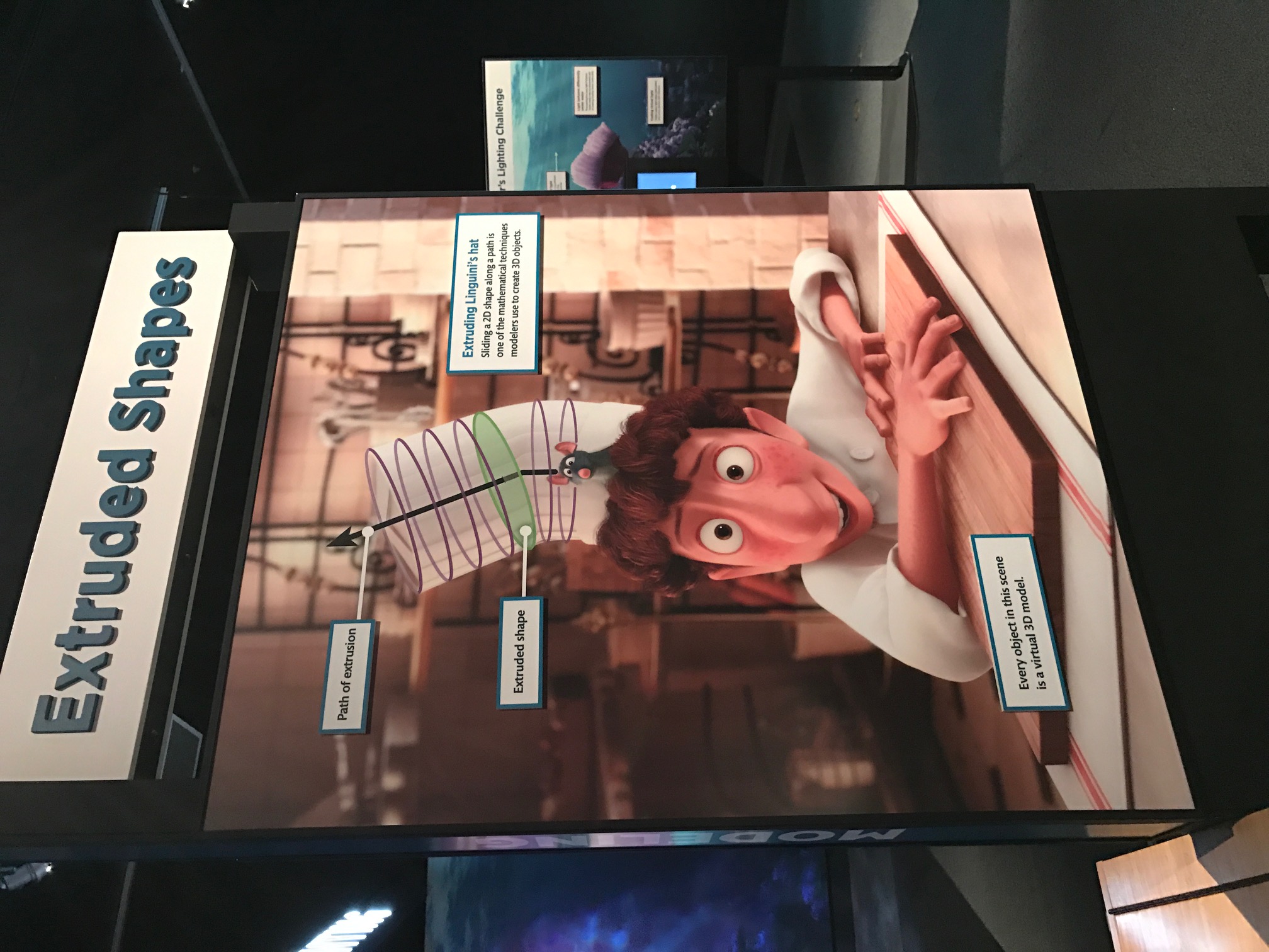 So to be able to check out the Science Behind Pixar before it opened to the public was pretty incredible. We started with a little movie explaining the “science” behind how Pixar movies are made.We learned that there are 24 frames per second of movie. We then headed into a 12,000 square foot exhibit that shows all the concepts behind the Pixar movies. Some of the exhibits we were able to manipulate and experience included: