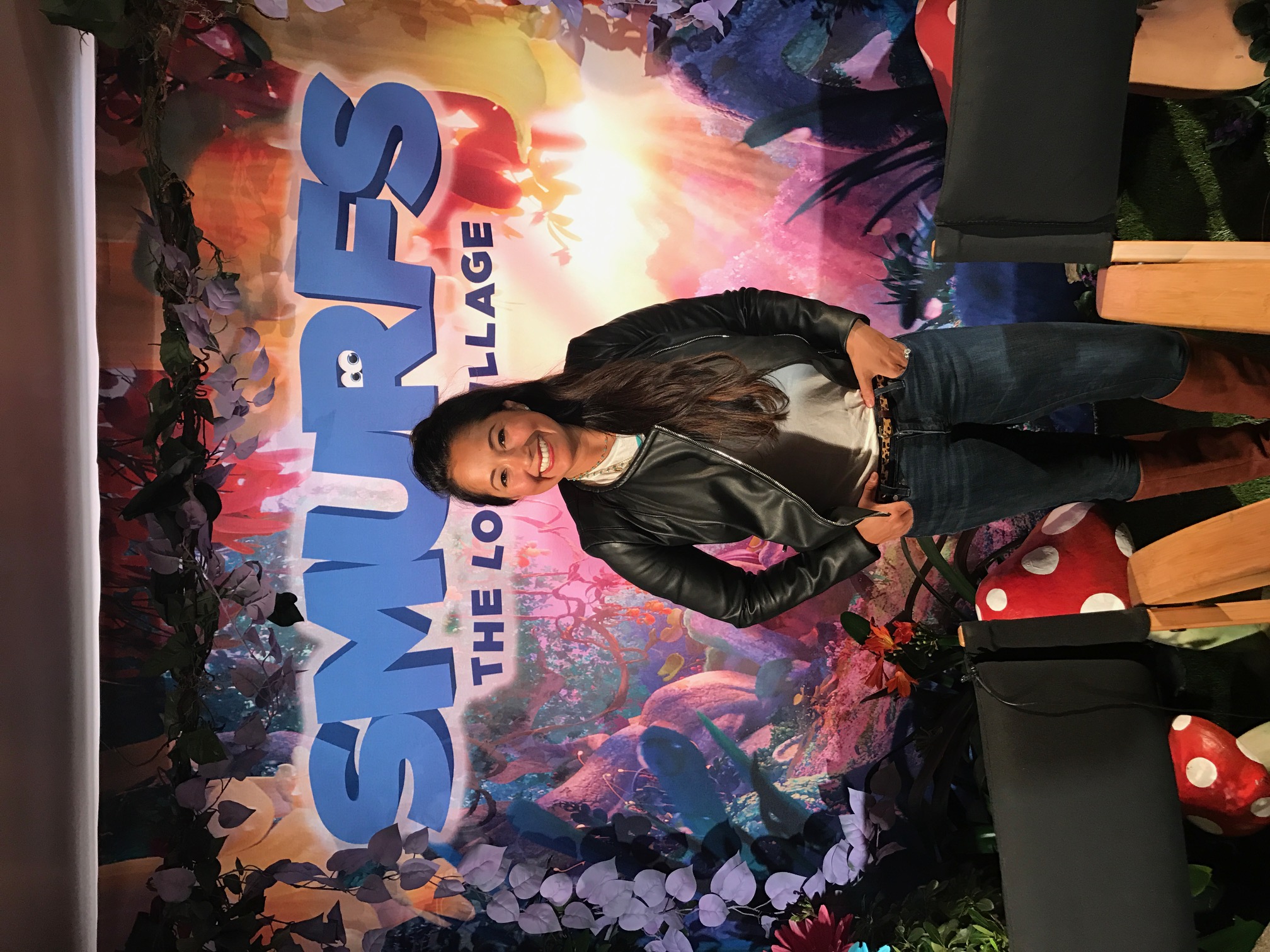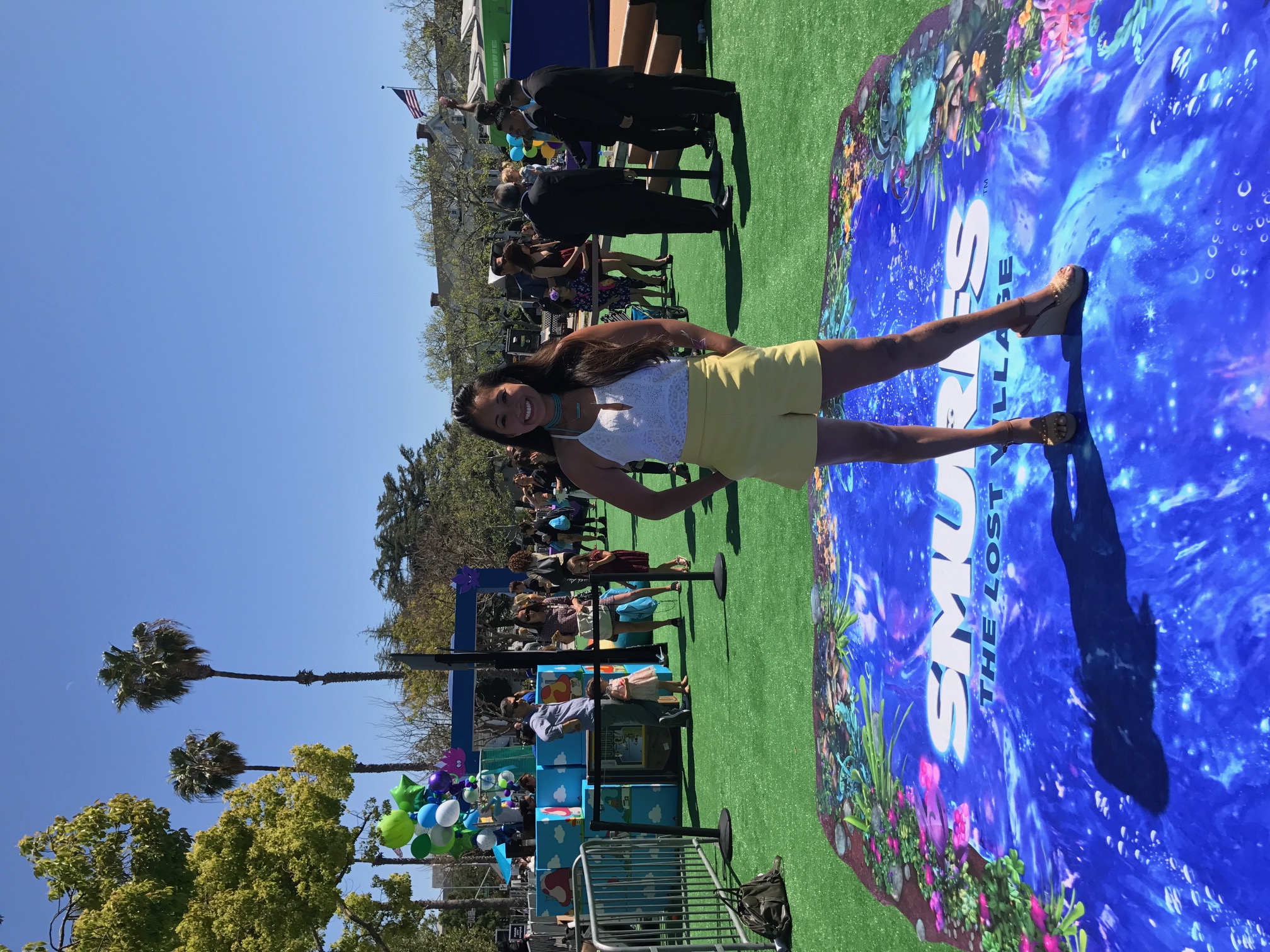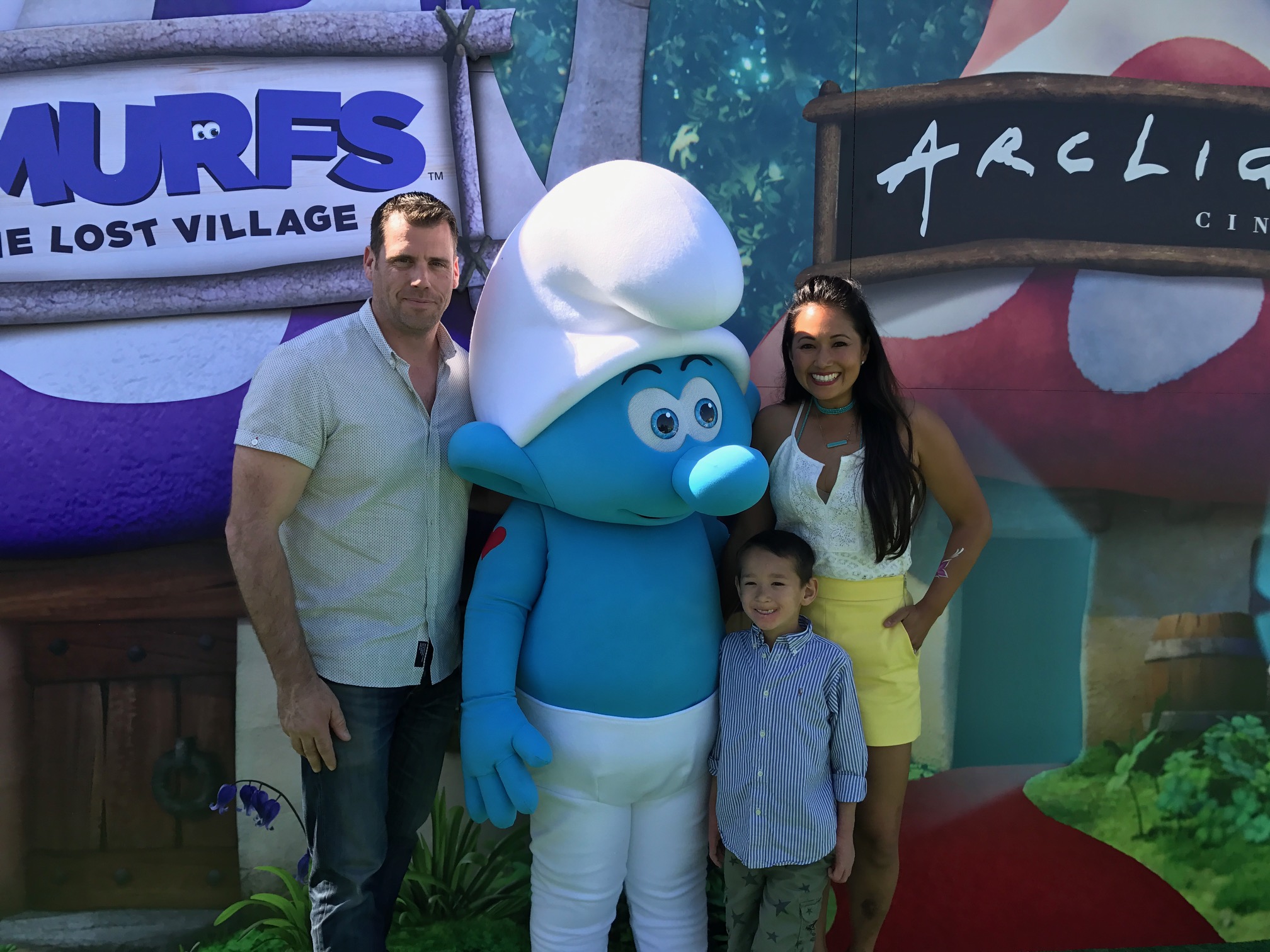 Saturday April 1st, my little family and I headed to the latest Sony Pictures movie Smurfs: The Lost Village for the world premiere in Downtown Culver City. Well Downtown Culver City was completely redone to look we walked right into a Smurf Village. As we checked in, we were given a selection of Smurfs hats to choose from, then were handed balls to Smurfette dunk tank filled with bouncy balls, life-sized Smurf characters such as Brainy and Papa Smurf were on hand to take family photos with as well there bring the cutest Mushroom/Forest inspired bouncy house for the kiddos to go crazy.