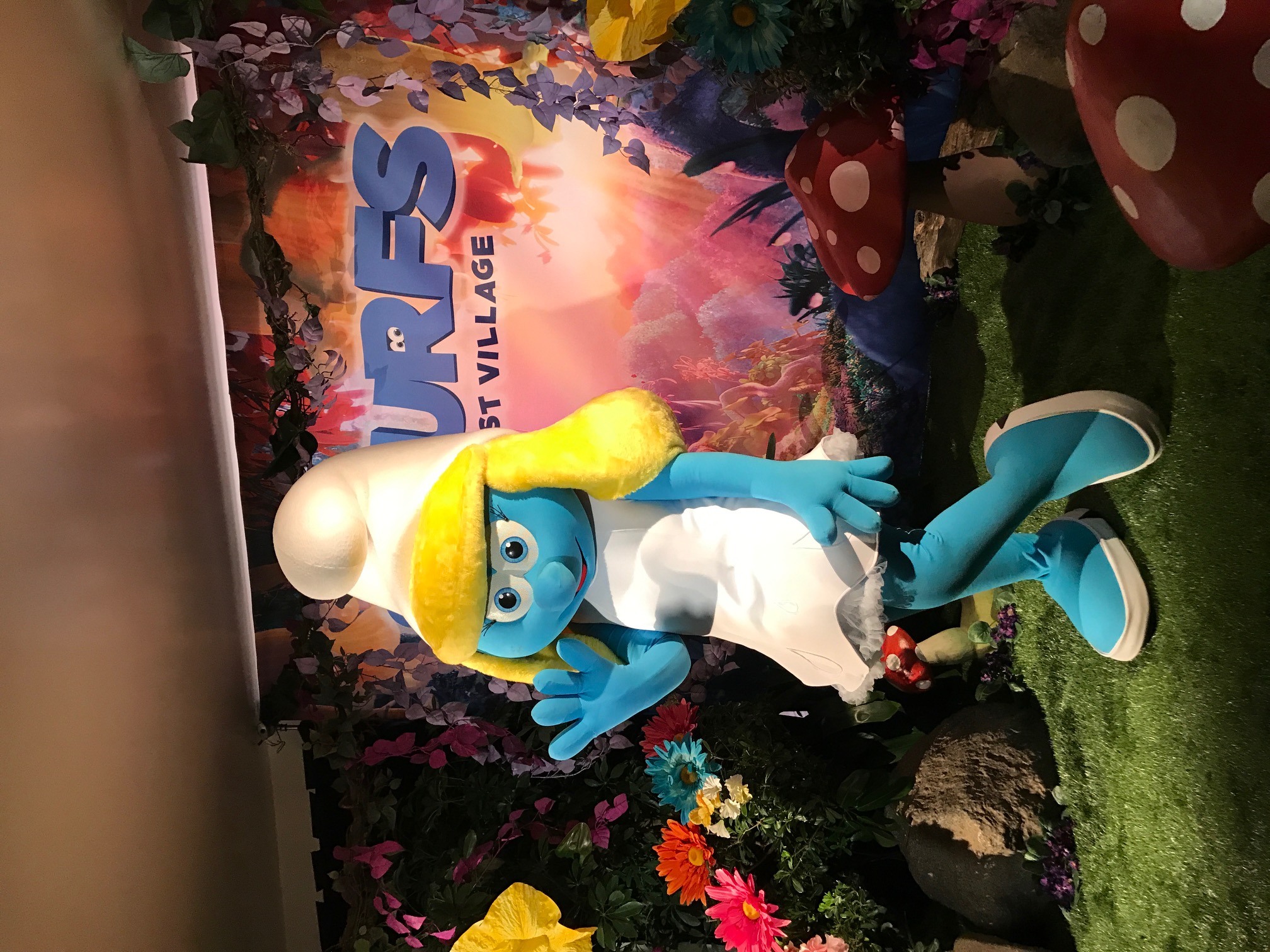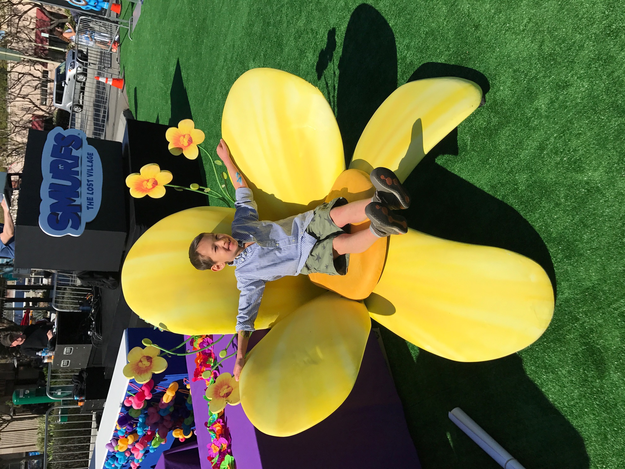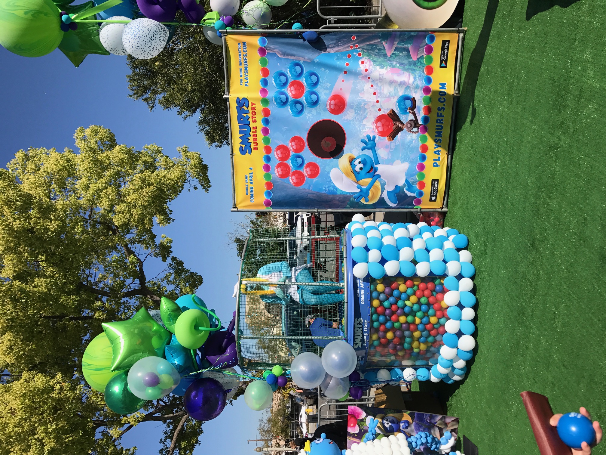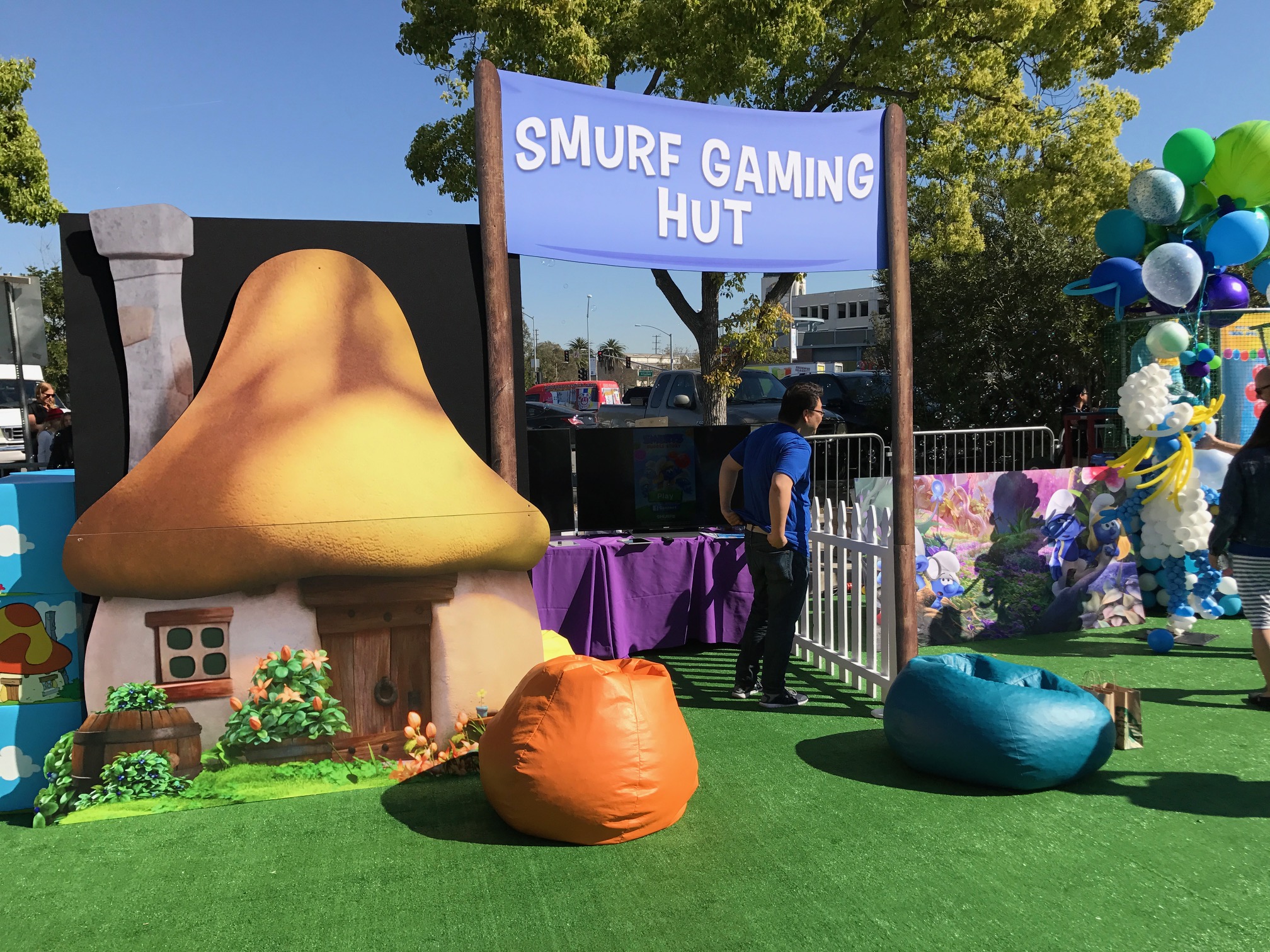 Saturday April 1st, my little family and I headed to the latest Sony Pictures movie Smurfs: The Lost Village for the world premiere in Downtown Culver City. Well Downtown Culver City was completely redone to look we walked right into a Smurf Village. As we checked in, we were given a selection of Smurfs hats to choose from, then were handed balls to Smurfette dunk tank filled with bouncy balls, life-sized Smurf characters such as Brainy and Papa Smurf were on hand to take family photos with as well there bring the cutest Mushroom/Forest inspired bouncy house for the kiddos to go crazy.