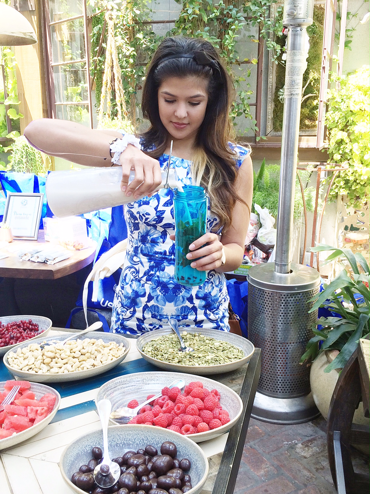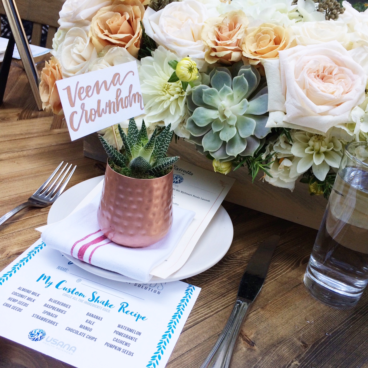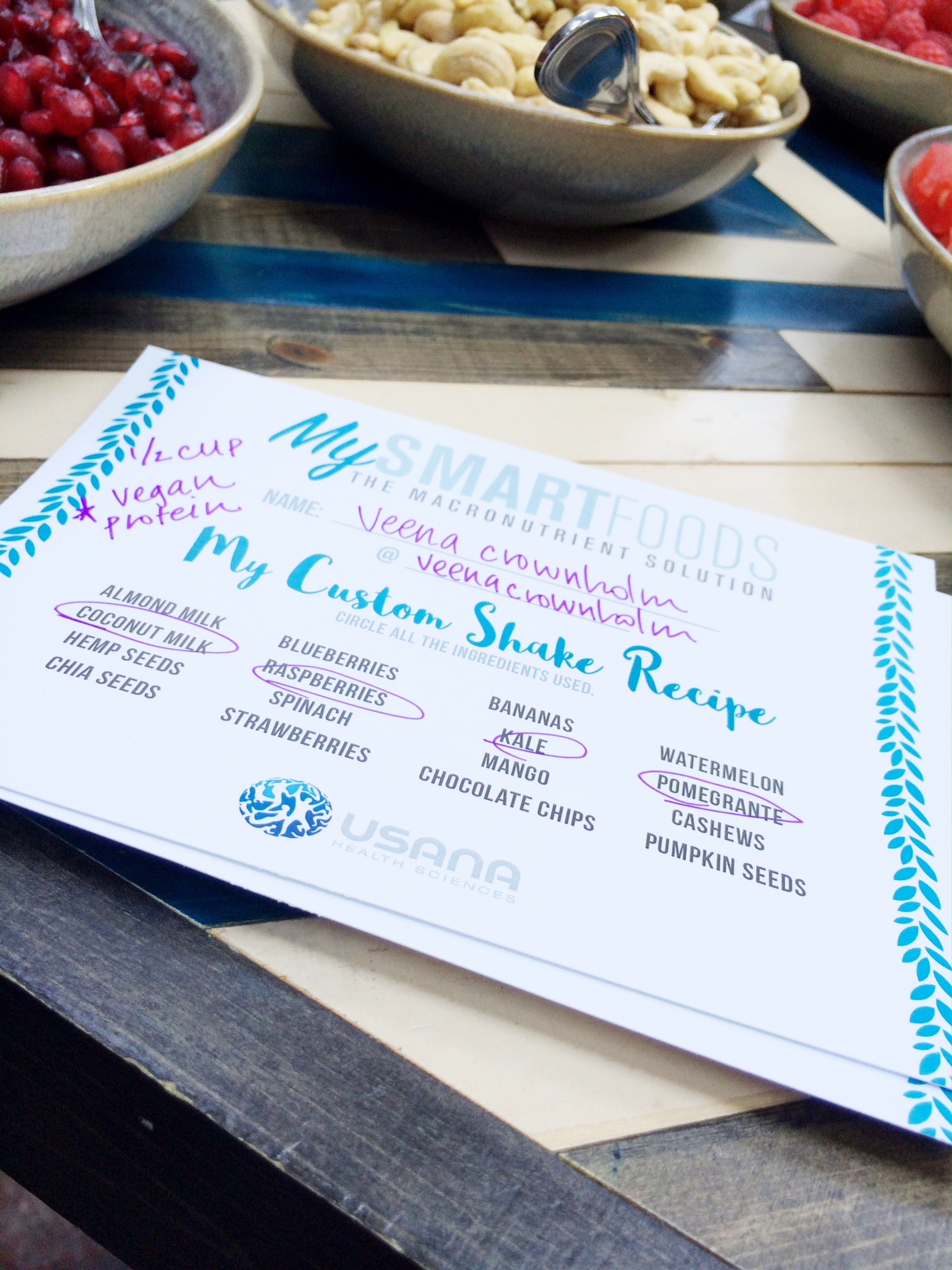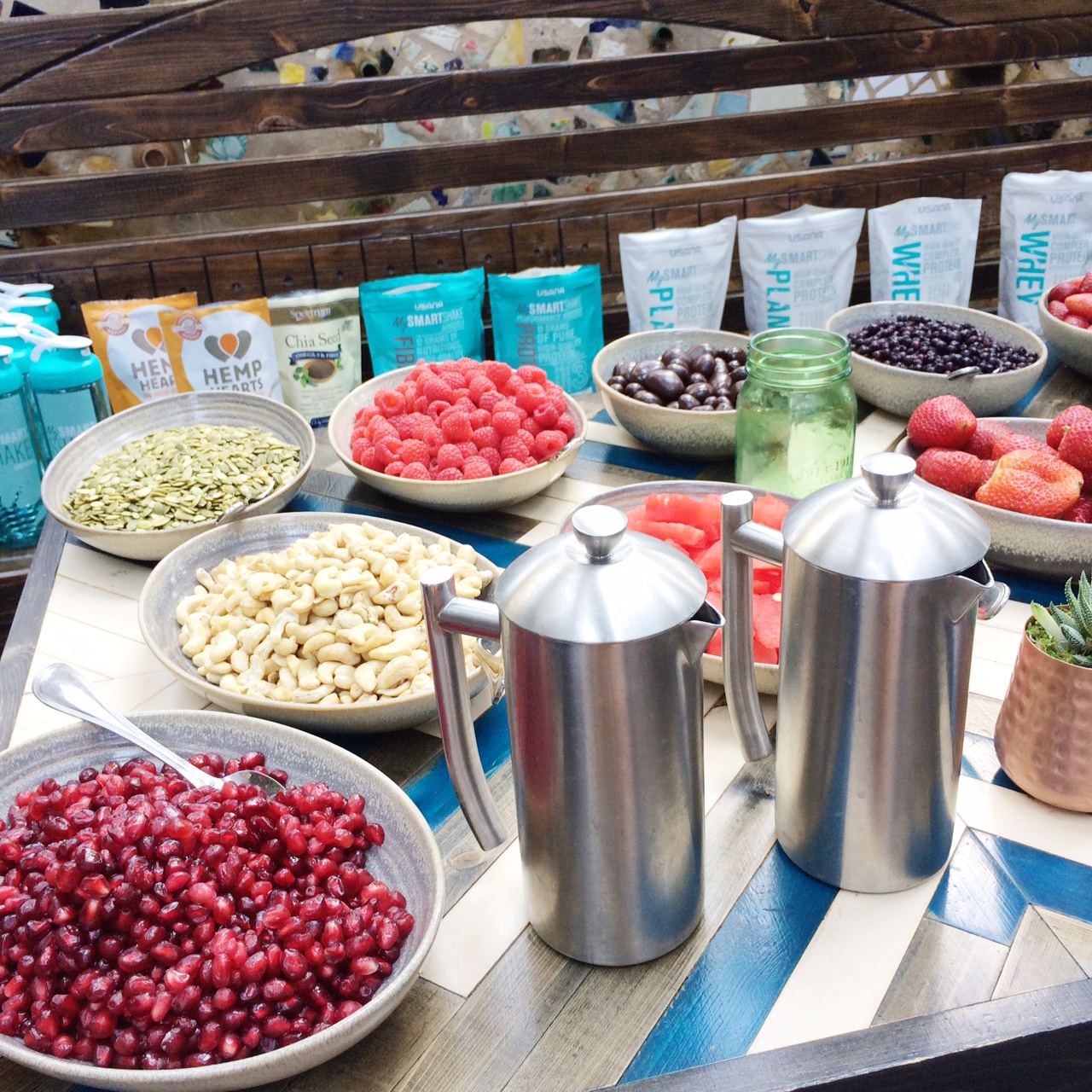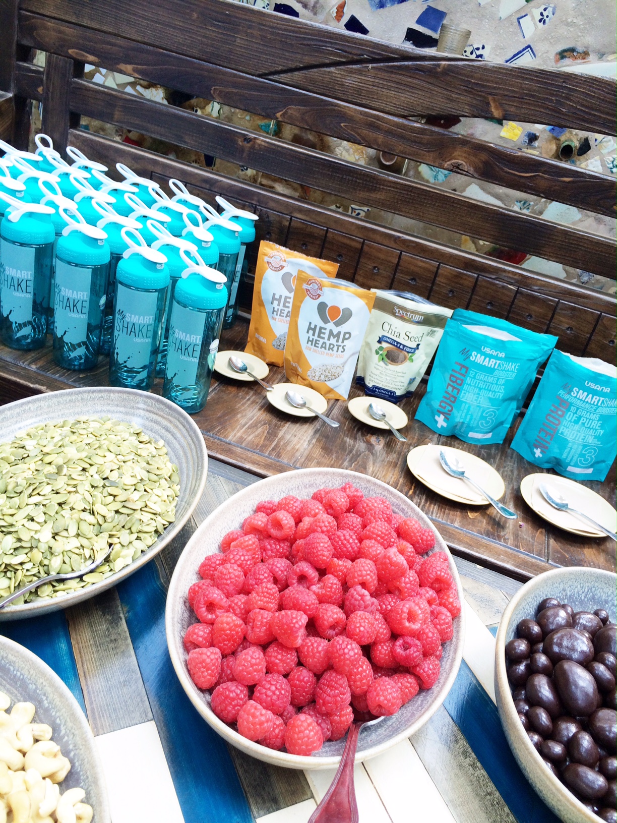 There was a full fruit, veggie, nut and seed bar that we were able to make our own shake concoctions with. First you chose the fruit/veggie/nut/seeds, then you added in whey or plant based protein powder (plant based for me-USANA’s is pea and potato protein), add in your milk choice and then top it off with a flavor optimizer (Dark Chocolate, Cappuccino, Peach Mango, Banana, Orange Cream) or you can stick with the vanilla base that comes with the protein powder. What I loved was there was no sugary or stevia taste to the shake.
